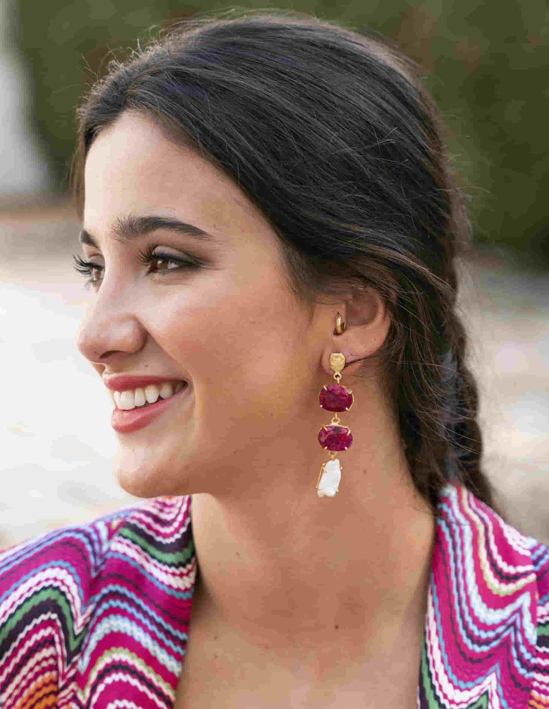 Preciosos pendientes largos de piedras naturales rubí y blancos para invitadas. Este complemento tan ideal está realizado con estructura de latón con baño en oro y compuesto por dos piedras irregulares de color rubí y acaba con otra piedra más alargada en color blanco.
