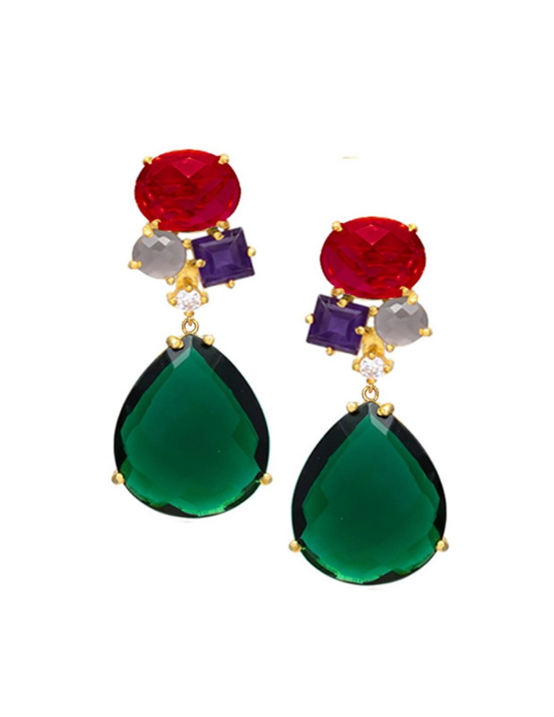 Pendientes de fiesta verdes con piedras geométricas de colores rojo, gris y morado, perfectos para eventos especialmente de noche.