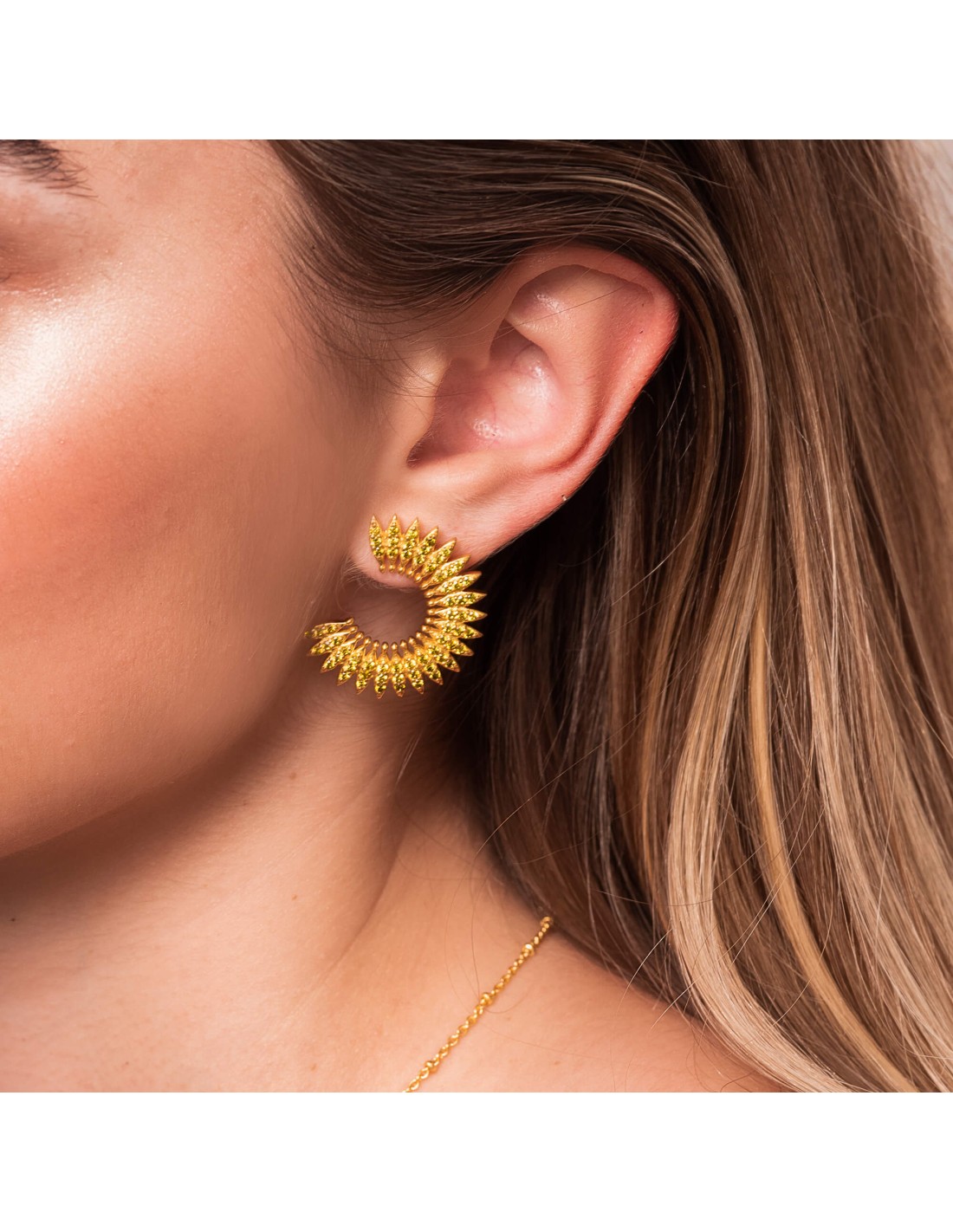 Completa tu look para tu próximo evento y elévalo con estos pendientes dorados, ideales para combinar con cualquier prenda. Con un diseño circular de palmera con circonitas incorporadas que le darán luz a tu look. Con un acabado en baño de oro de 22k y cierre de mariposa. Ideales para cualquier ocasión especial en la que quieras brillar.