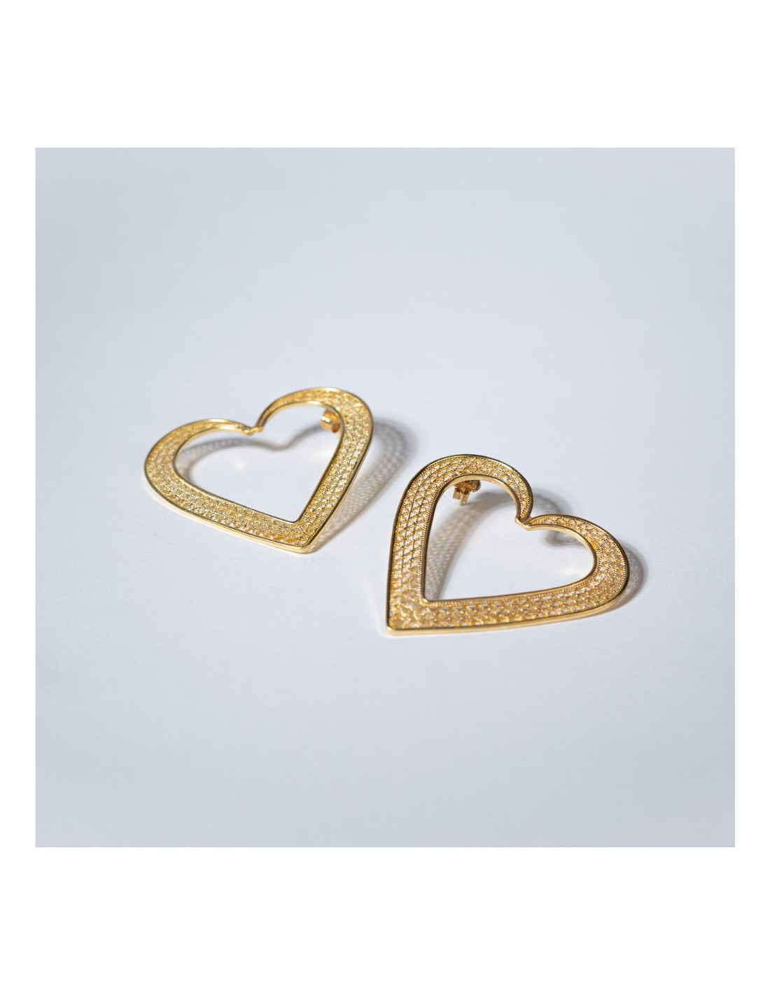 Estos maxi pendientes dorados en forma de corazón son una declaración de estilo y feminidad. Elaborados artesanalmente en Plata de Ley 925 con un refinado baño de oro de 18 quilates, cada pieza recrea el símbolo del corazón a través de una exquisita filigrana, evocando un dibujo etéreo similar al encaje tradicional.