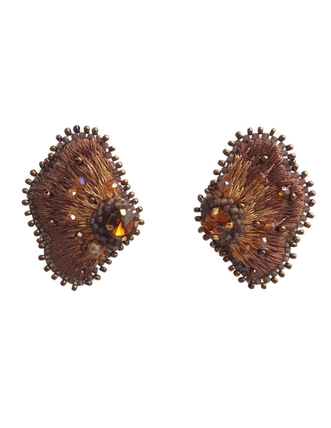 Estos pendientes bordados combinan precisión artesanal y diseño contemporáneo en una pieza sofisticada y llamativa. Bordados a máquina con detalle, recrean la forma de una media flor en capas de reflejos textiles que aportan profundidad y movimiento visual. El borde está delicadamente delineado con mostacillas, mientras que cristales facetados estratégicamente ubicados añaden destellos vibrantes.