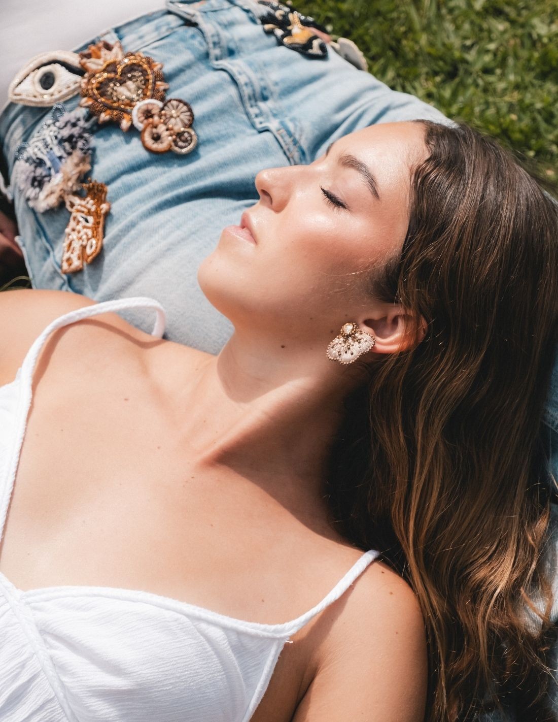 Estos pendientes media flor son la versión suspendida de nuestra flor más encantadora, combinando feminidad, elegancia y diseño artesanal. Cada pieza presenta una media flor bordada en capas que cuelga delicadamente desde un cristal central, aportando movimiento y sofisticación. El borde está finamente decorado con mostacillas, mientras que pequeñas facetadas sobre los pétalos reflejan la luz con sutileza, generando un efecto luminoso y delicado.