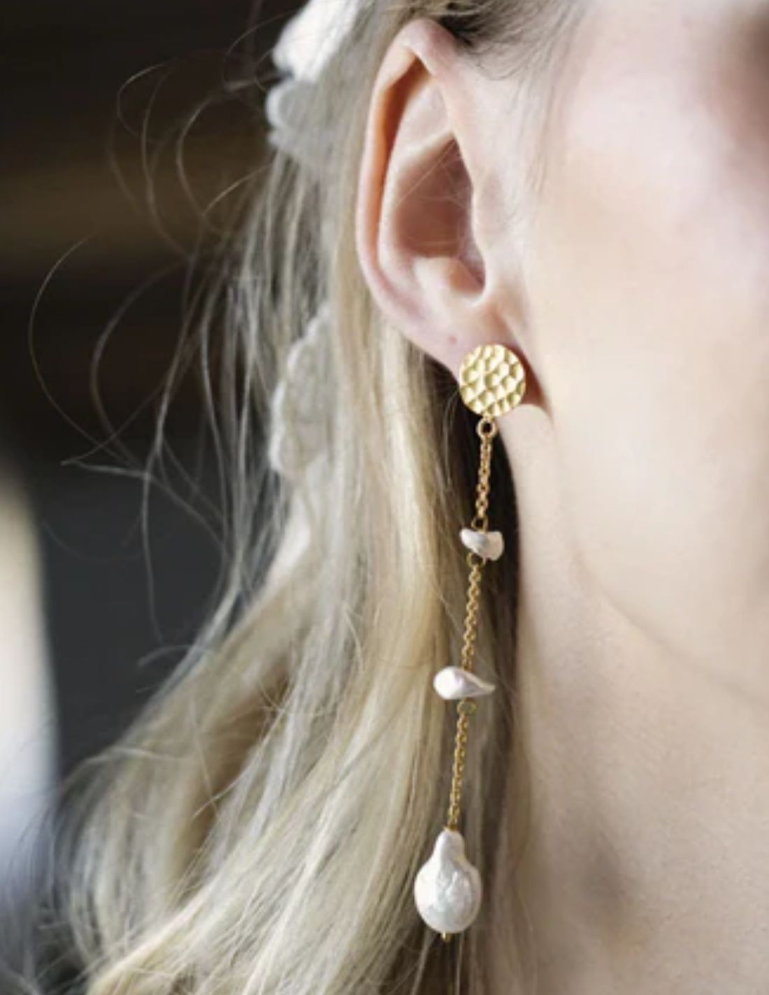 Estos pendientes combinan delicadeza y elegancia moderna en un diseño compuestos por una cadena fina de latón bañado en oro, que aporta un toque sofisticado y contemporáneo, acompañadas por perlas con formas irregulares, creando una pieza equilibrada y versátil. Su diseño alargado estiliza la silueta y ofrece un efecto ligero, ideal para complementar tanto looks formales como conjuntos cotidianos.