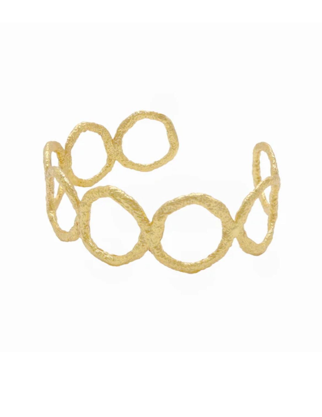 Esta pulsera dorada se convertirá en tu accesorio de confianza. Querrás combinarla con todo tipo de looks, tanto casuales como formales en ocasiones especiales. Realizado con un diseño de circunferencias, sencilla y elegante que se convertirá en un imprescindible en el joyero de cualquiera. Realizada en latón bañado en oro. Fácil de combinar y un complemento atemporal que no puede faltar en tus looks.