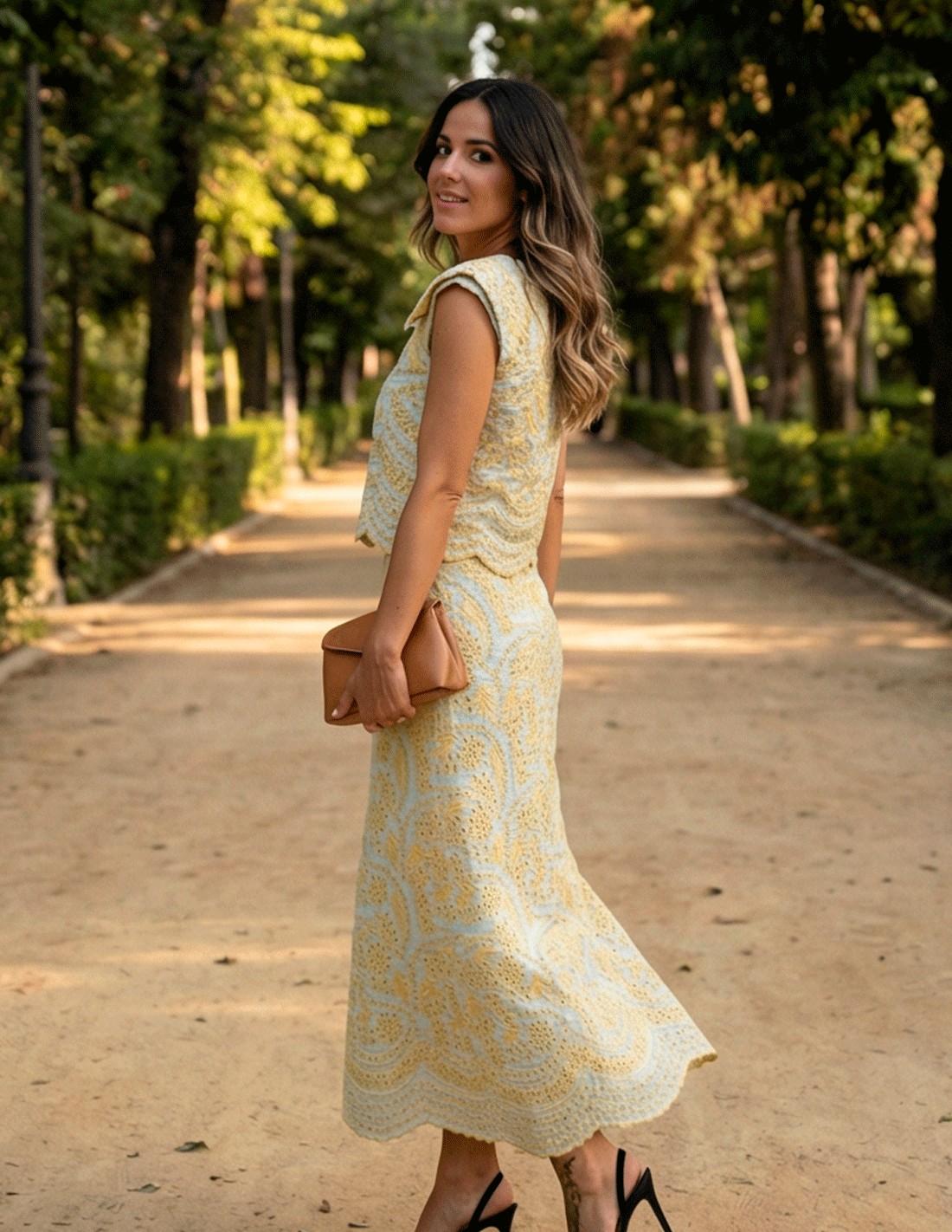 Conjunto amarillo de invitada con tejido troquelado