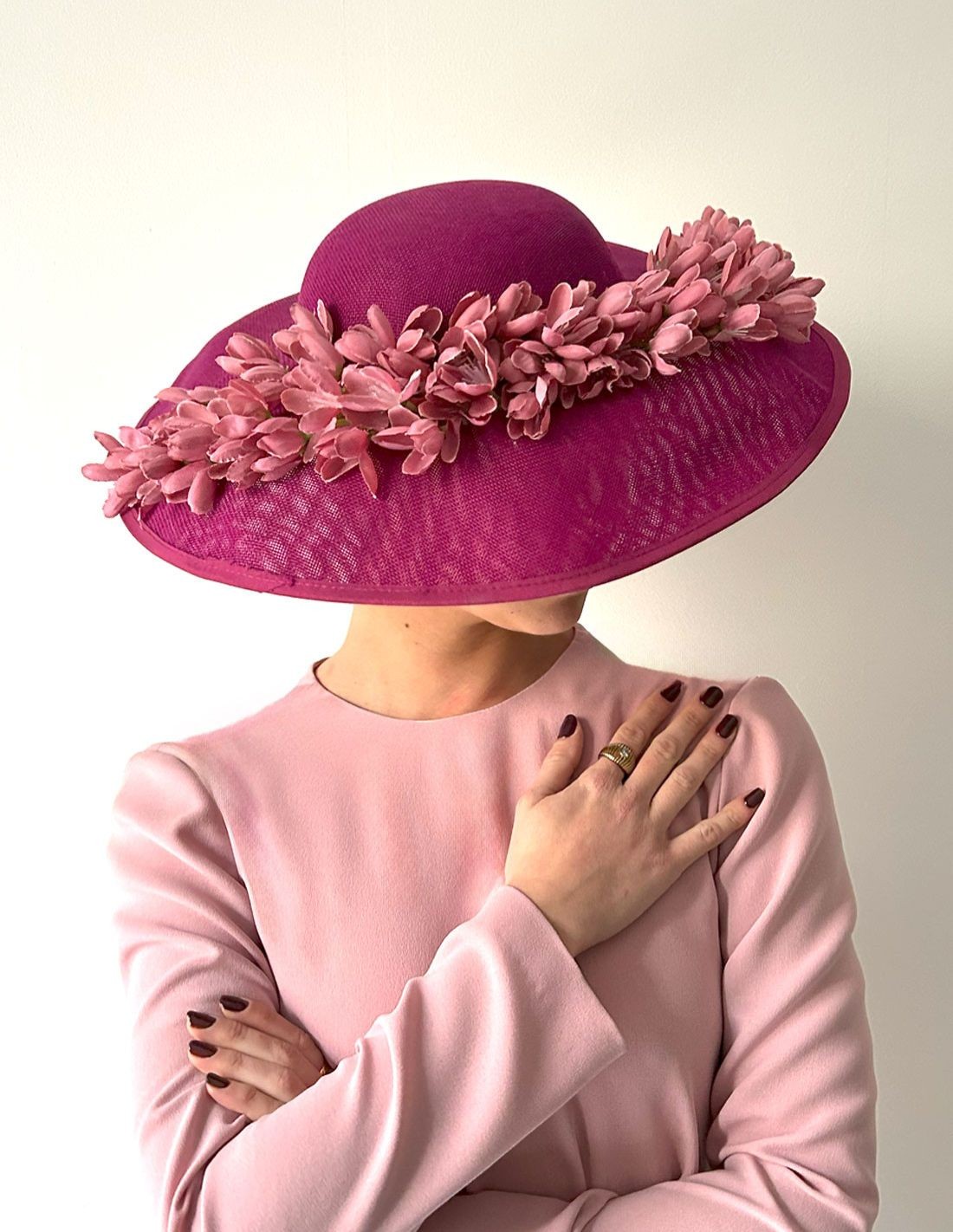 Esta pamela para invitada es perfecta para tu próximo evento de primavera. La base es de color buganvilla y está decorada con flores en tonos rosas más claros, creando así una combinación elegante y sofisticada. Ideal para boda de día, ¡serás una invitada perfecta!