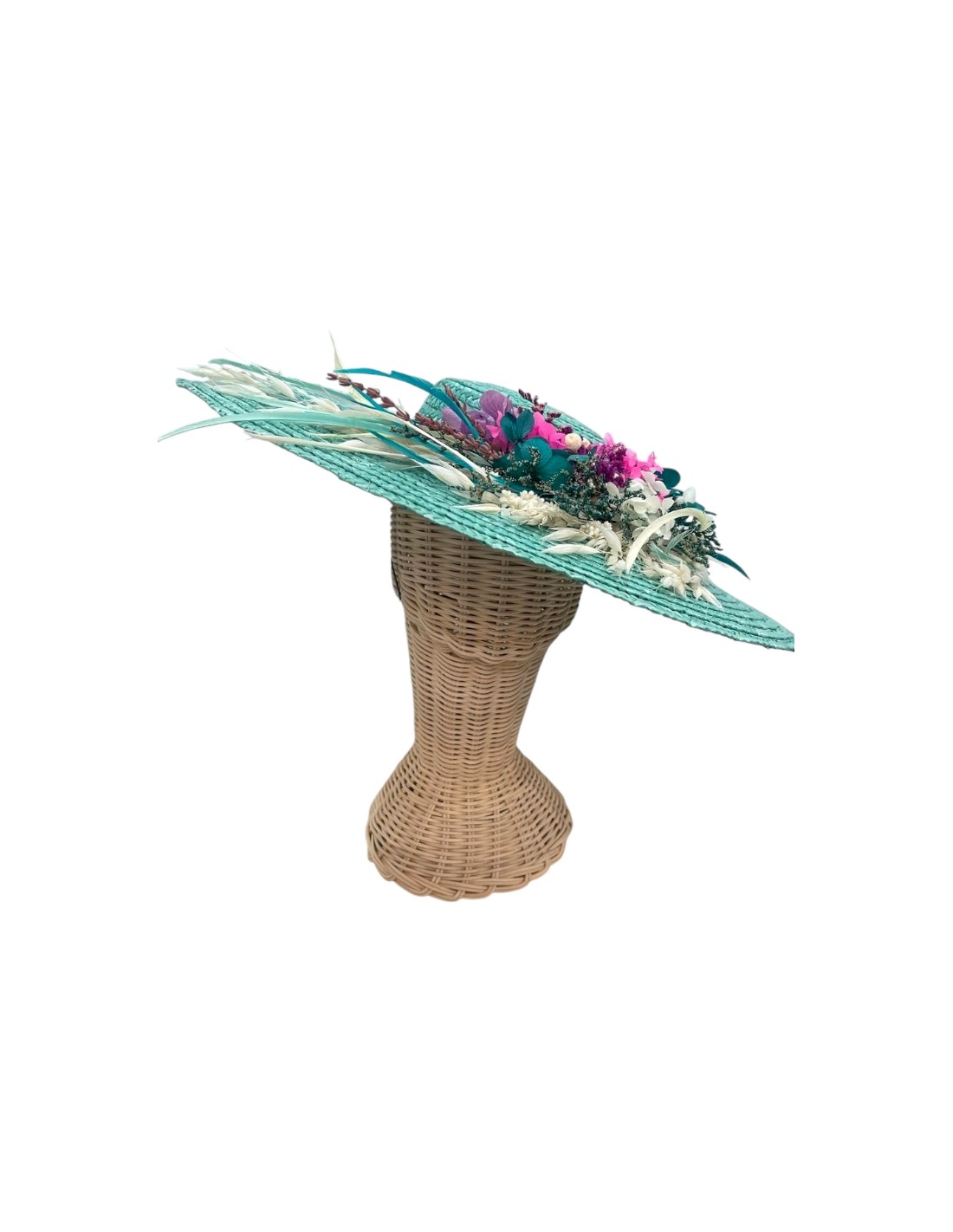 Si tienes un evento especial próximamente y deseas completar tu look con un complemento que marque la diferencia, esta pamela de invitada puede ser tu opción ideal. Una pamela confeccionada artesanalmente en color verde agua, con detalle de adorno floral en varios colores en el lateral y con diadema para su correcta sujeción. Ideal para elevar tu look al máximo, brillarás seguro.