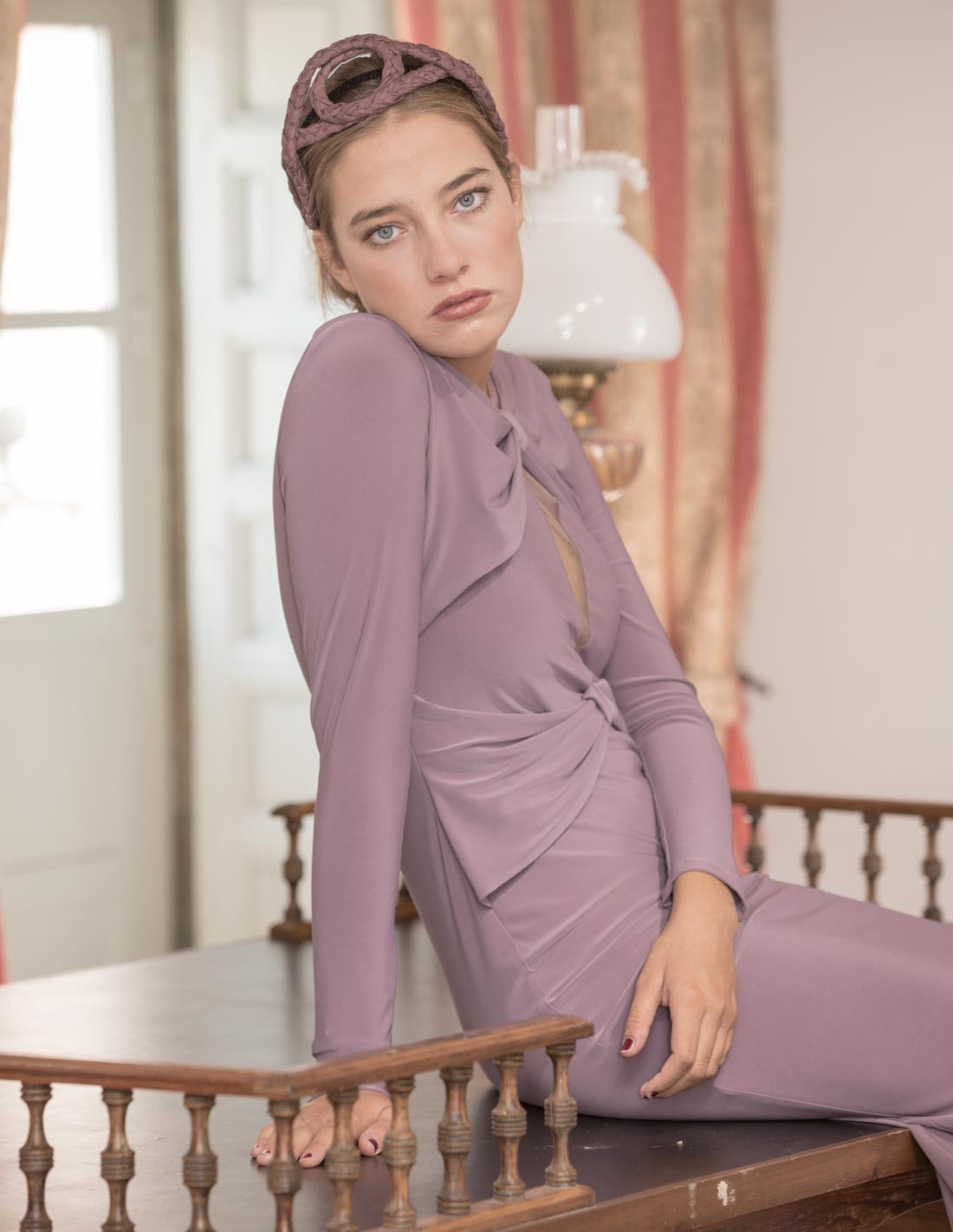 Somos partidarios del berenjena en otoño, ¡serás la invitada perfecta! Combina este delicado complemento con este vestido de fiesta largo sirena con escote y detalle fruncido.