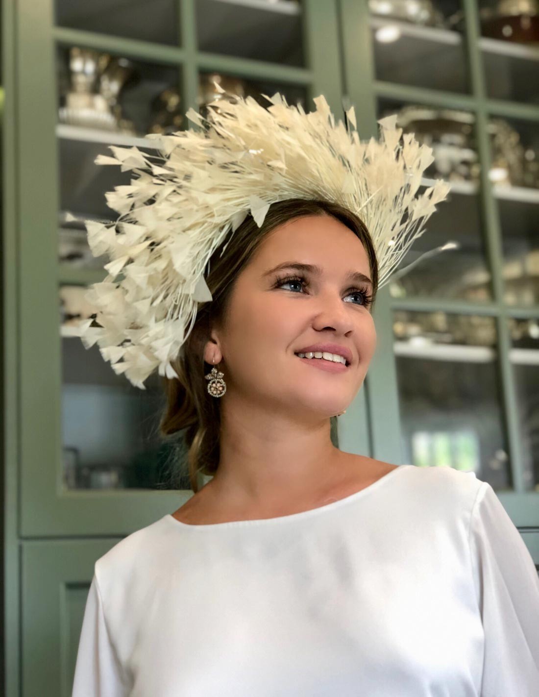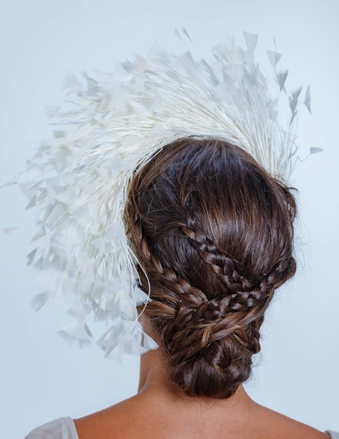 Tocado de novia con plumas naturales.