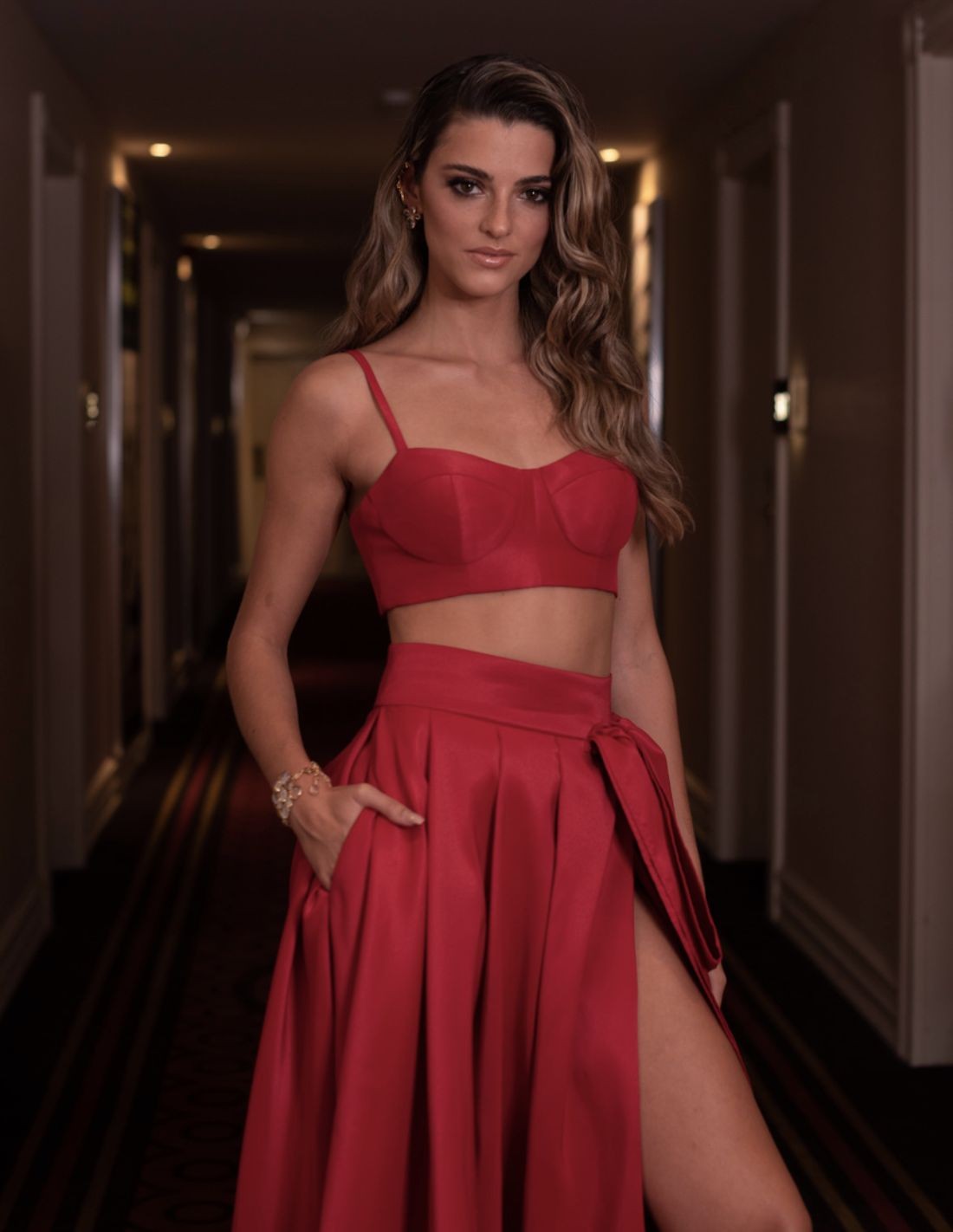 Top de tirantes rojo con escote balconette para eventos especiales.