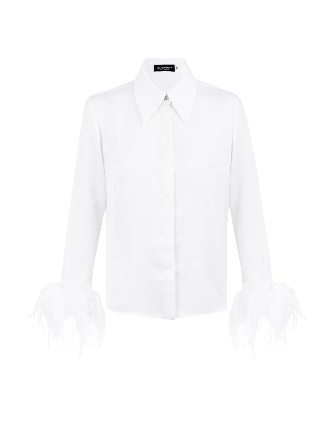 Una camisa con la que elevarás tu look a la sofisticación. De corte clásico con pinza en el pecho creando una figura más esbelta. Tiene cuello pico y un detalle de botón joya plata en el mismo. Esta camisa se convertirá en tu preferida gracias a sus puños con plumas, ideal para cualquier fiesta o evento que tengas.