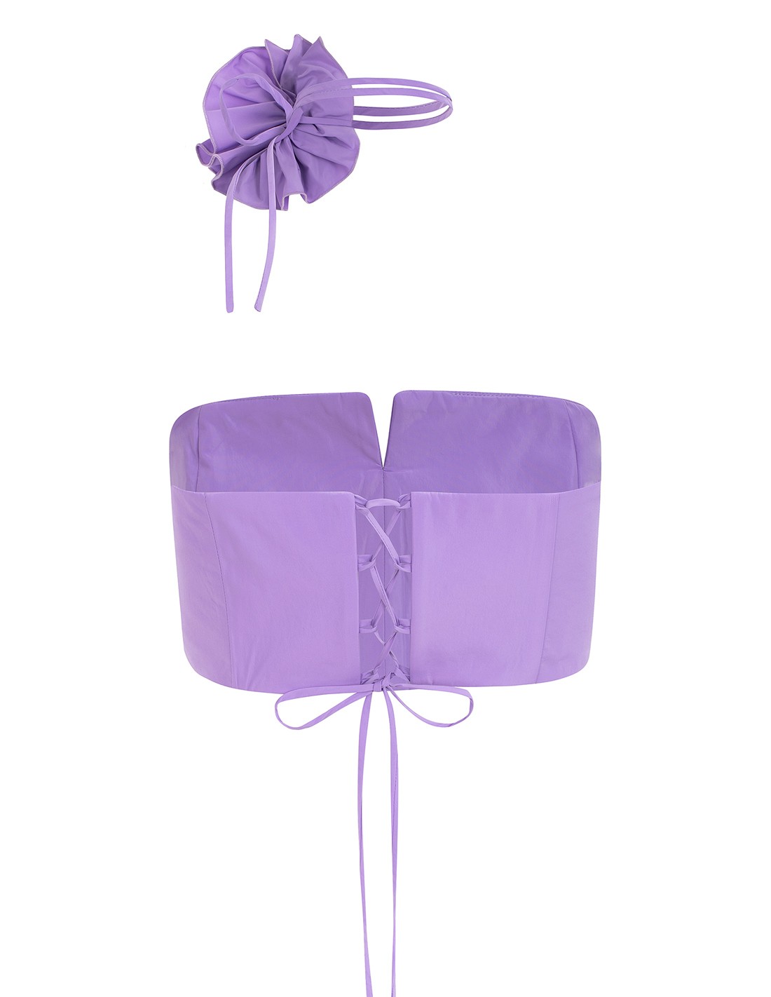 Uno de los conjuntos más especiales de la colección. Una de sus piezas, este crop top de palabra de honor que se ajusta por la espalda estilo corpiño. Lleva el detalle de la flor en el cuello que le da ese toque totalmente en tendencia. Va a conjunto con su falda en mismo tejido formando así el conjunto de la temporada que no querrás quitarte. Disponible el color lila y el color rojo.