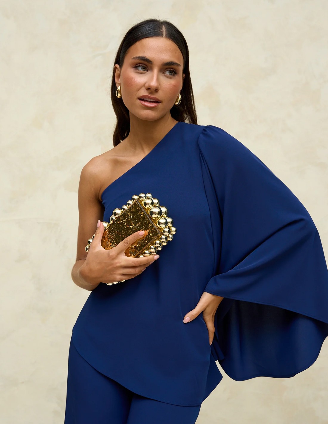 Blusa de fiesta asimétrica con manga acampanada en color azul marino.