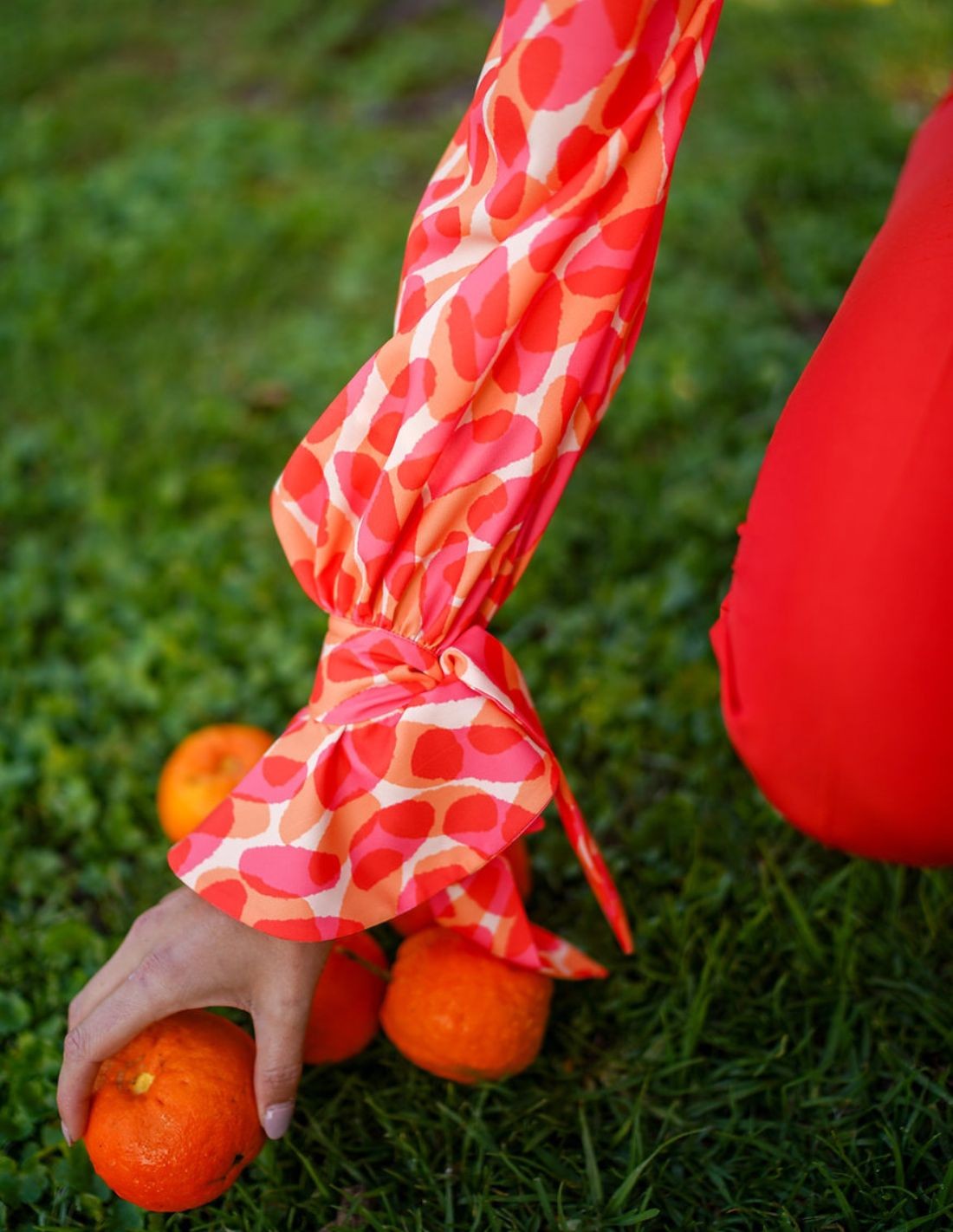 Esta blusa de fiesta incorpora un llamativo y colorido estampado en tonos naranjas, rojos y blancos, formando una combinación de colores perfecta para la temporada de primavera verano. Es un diseño muy especial de manga larga con cuello de volantes y abertura en la espalda.