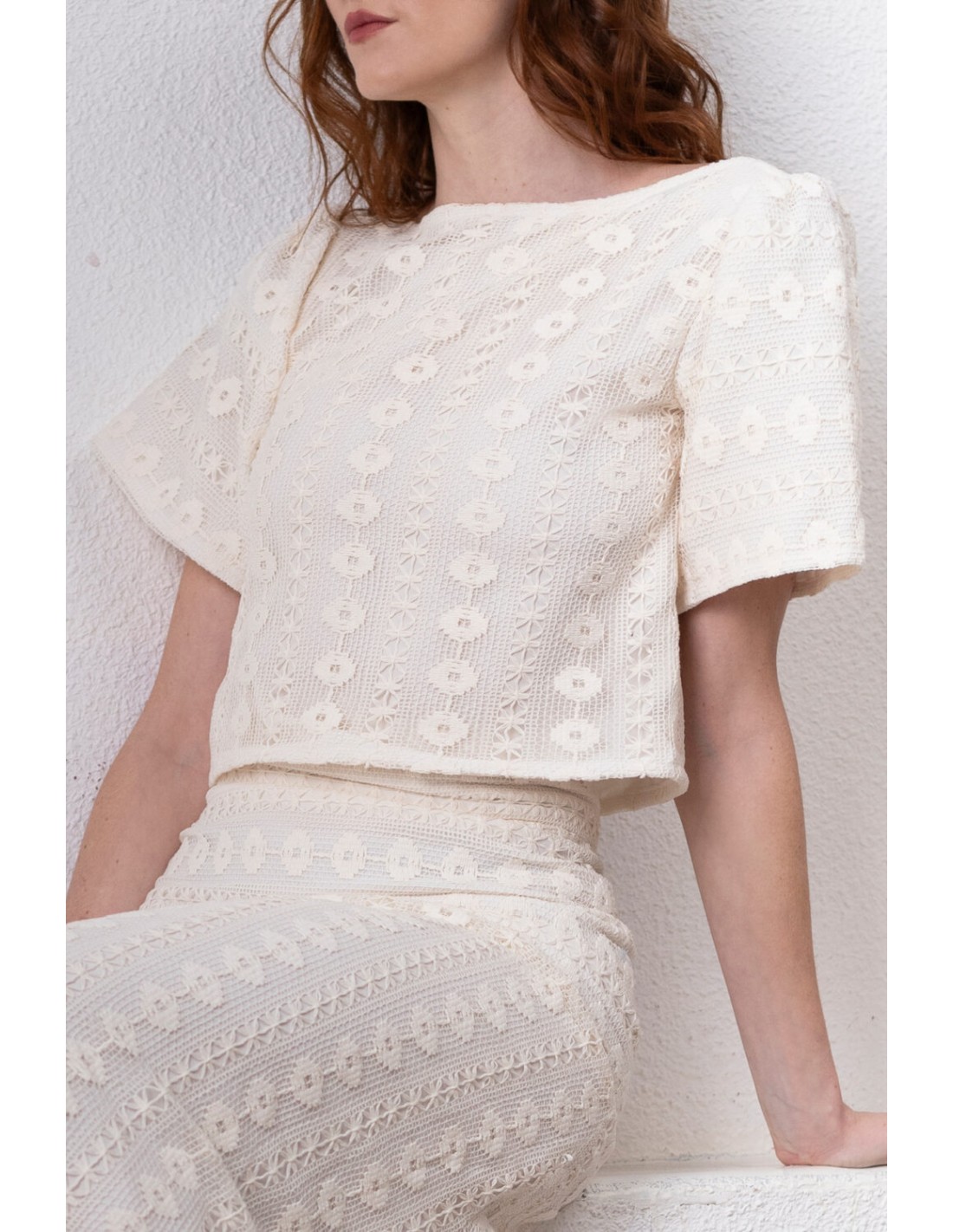 Este top marfil de macramé con manga corta tipo globo es una prenda femenina, con carácter y gran atención al detalle. Su diseño artesanal y textura delicada en algodón 100% ofrece un acabado sofisticado y natural, realzado con un forro interior de crepé que garantiza comodidad.