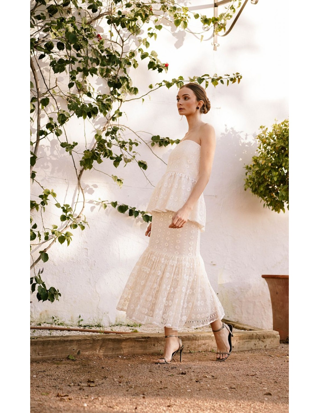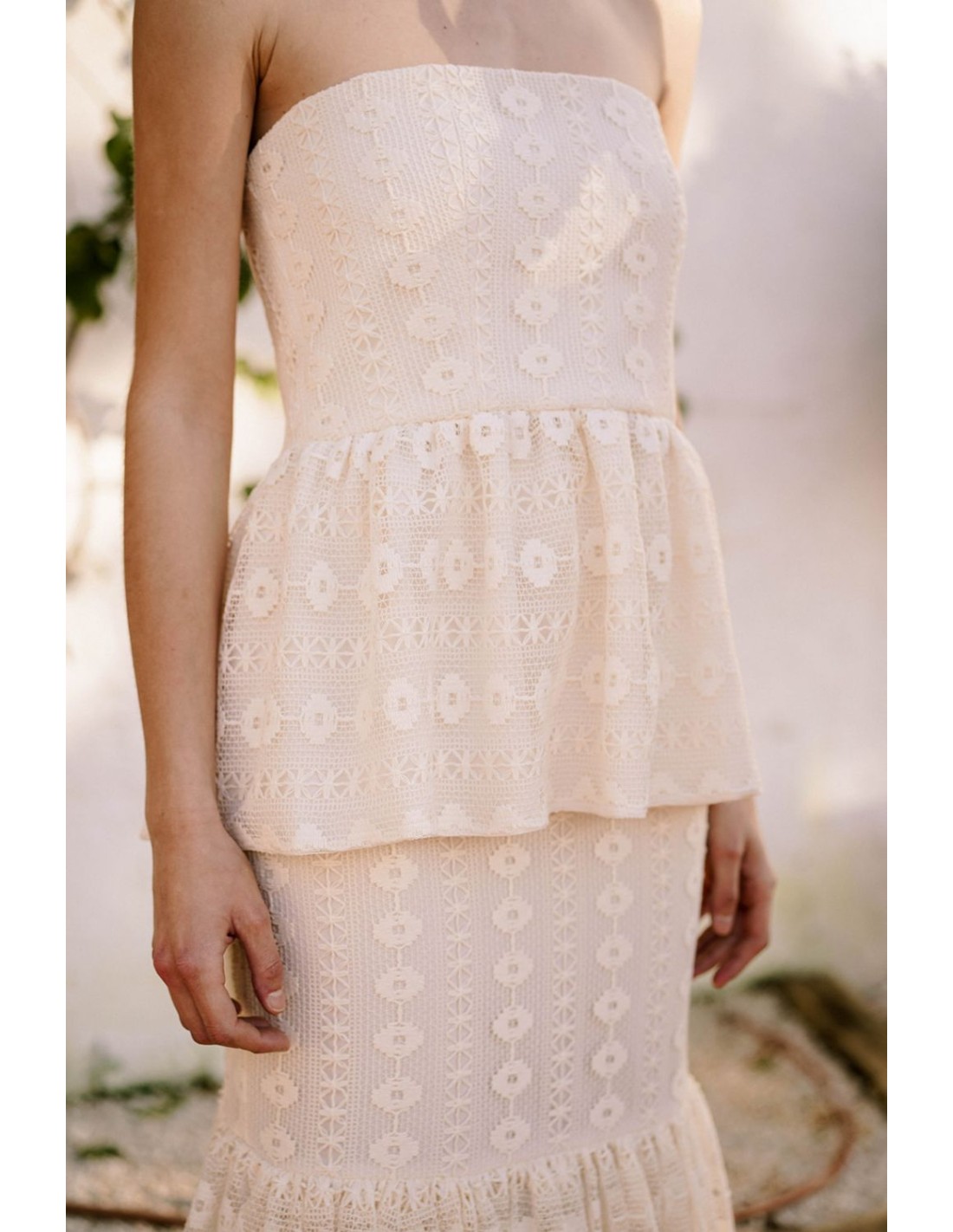 Este top palabra de honor marfil con péplum en color crudo es una pieza clave para tus looks más especiales. Confeccionado en un exquisito tejido de macramé 100% algodón, incorpora un forro interior de crepé que aporta comodidad y estructura. Su diseño sin tirantes resalta hombros y clavículas, mientras que el detalle de péplum en la cintura estiliza la silueta y añade un toque romántico y femenino.