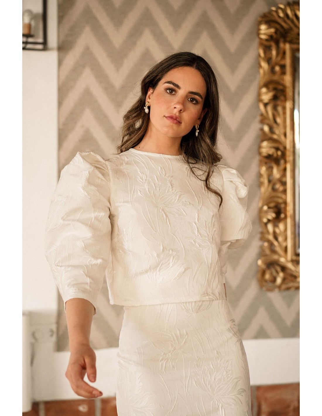 Completa tu look de invitada con este top brocado en color crudo con mangas abullonadas, una prenda sofisticada que combina estructura, romanticismo y tendencia en una sola pieza. Su tejido brocado de alta calidad y su diseño con volumen en las mangas hacen de este top una opción ideal para eventos, bodas o celebraciones especiales.
