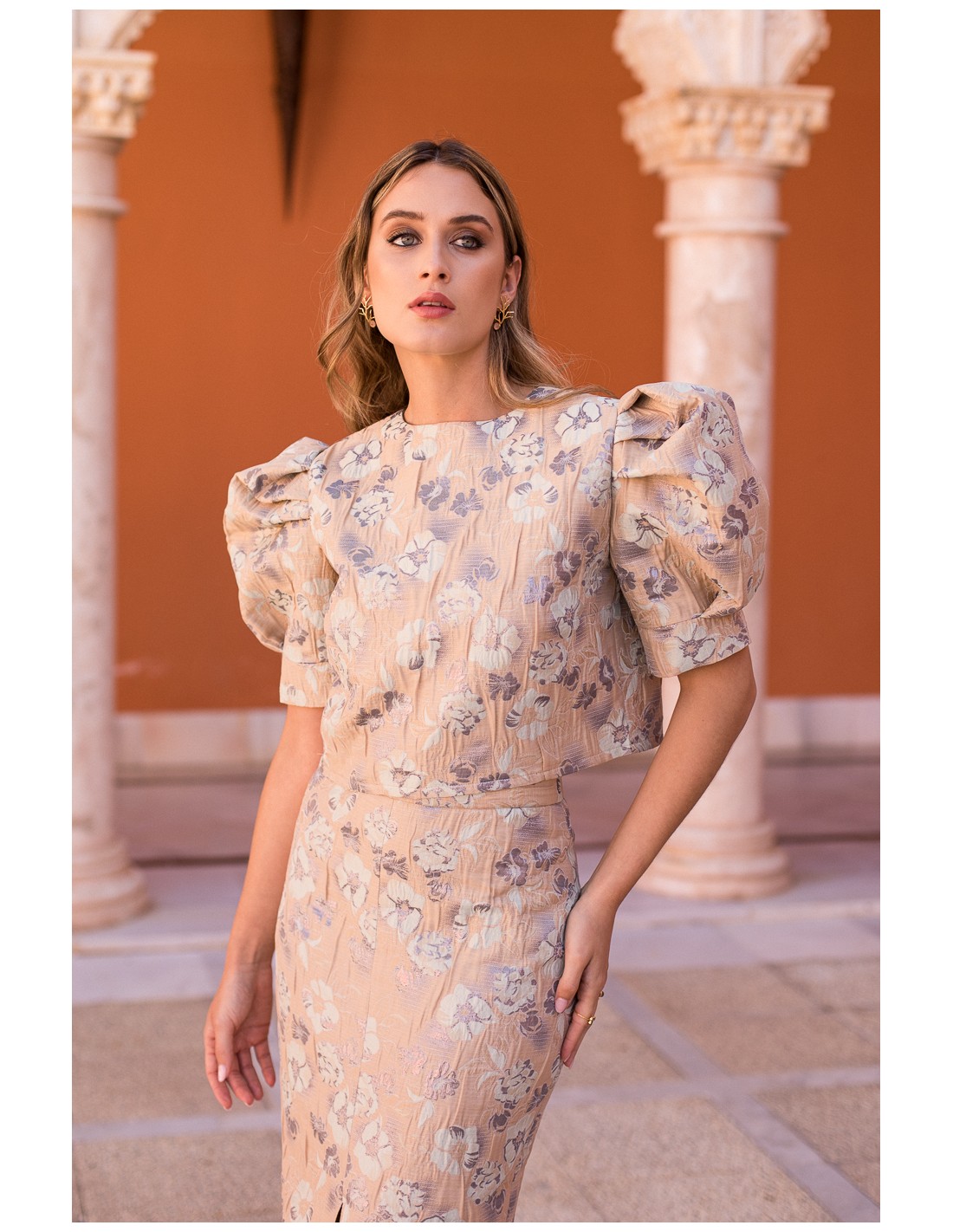 Luce con estilo y sofisticación este top brocado de flores en tonos dorado, verde agua y lila, una prenda vibrante y femenina que no pasa desapercibida. Su tejido brocado floral aporta textura, brillo y elegancia, mientras que las mangas al codo con volumen sutil añaden un toque moderno y refinado.