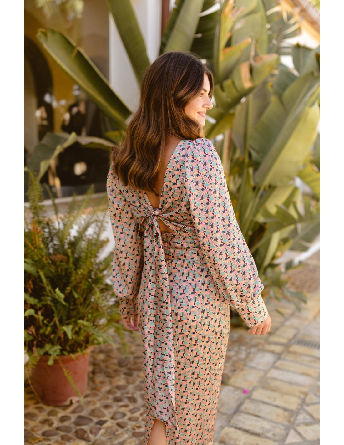 Atrévete a brillar con este top multicolor con estampado geométrico, una prenda llena de personalidad y estilo. Su diseño sin mangas y escote limpio destaca por la gran lazada en la espalda, que no solo asegura un ajuste perfecto, sino que añade un toque sofisticado y original.