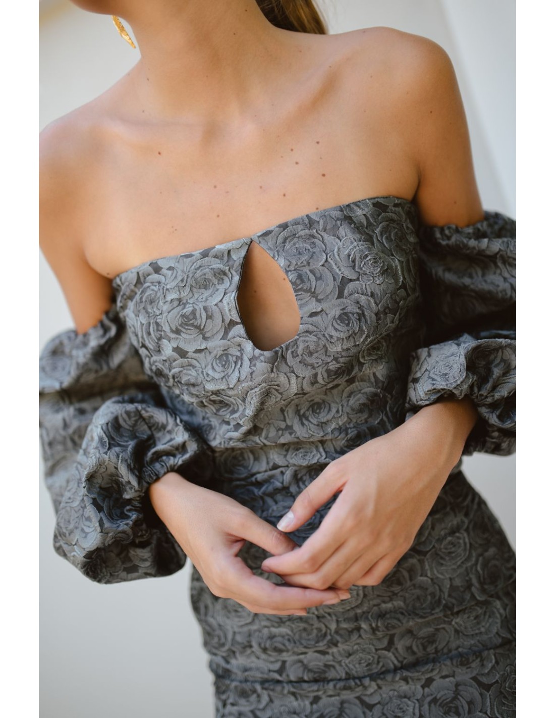 Este top de fiesta brocado gris y negro es una auténtica joya de diseño. Confeccionado en un espectacular tejido que simula rosas en relieve, combina elegancia y vanguardia a la perfección.