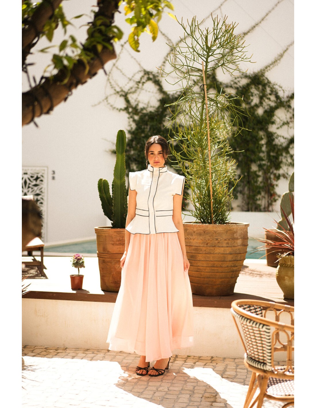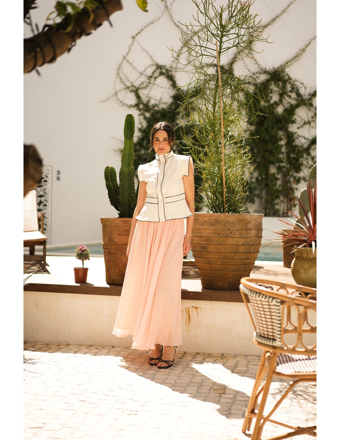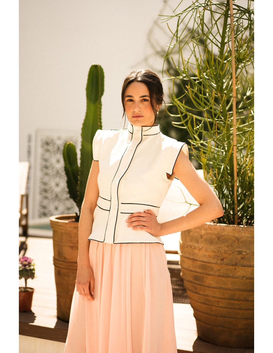 Este chaleco en crudo con vivos negros es el básico elegante que eleva cualquier look. Con un diseño minimalista pero lleno de estilo, su corte estructurado y contrastes definidos aportan un aire sofisticado y moderno. Ideal para llevar con looks más casuales o para cualquier ocasión especial. Una prenda versátil, atemporal y favorecedora.