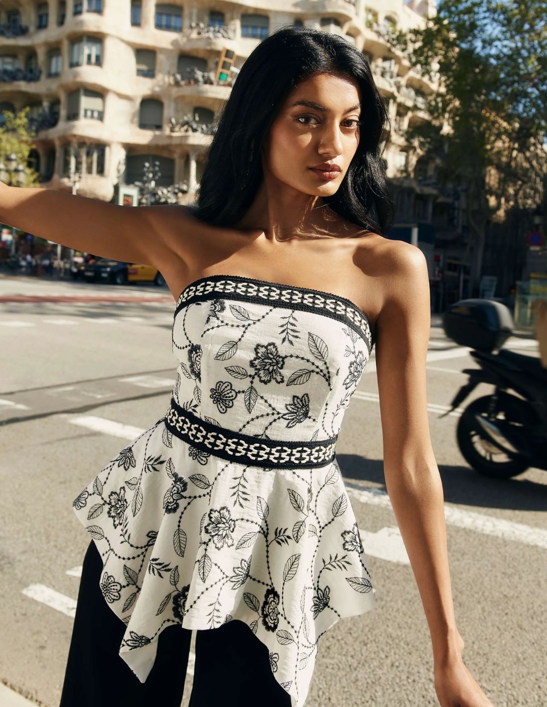 Si eres una invitada de primavera, este top para invitada será tu aliado para brillar. Realizado con un escote palabra de honor y un cuerpo bordado en tonos blanco y negro, con detalle de cintas bordadas. Incorpora un corte peplum asimétrico con vuelo que aporta ese toque elegante y sofisticado a la prenda. Confeccionado en tejido de algódon y lino. Ideal para eventos de día o de tarde, como graduación, comunión o bautizo.