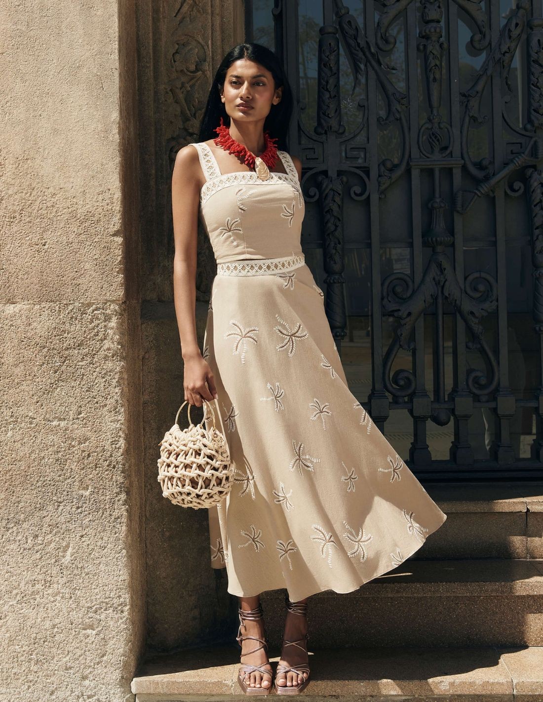 Si tienes un evento de verano y aún estás buscando el look ideal, este top para invitada será tu aliado perfecto. Este top estampado en beige, destaca por su escote cuadrado, sus tirantes anchos y su cinta decorativa en beige y blanco. Confeccionado en lino, con un dibujo de palmeras, la prenda más acertada para cualquier celebración. Puedes combinarla con la falda que completa el set.