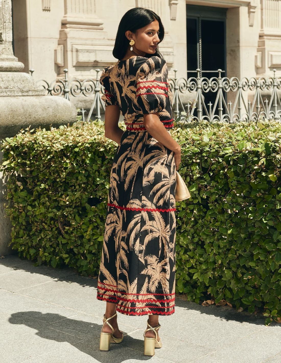 Si eres de las que apuesta pro conjuntos cómodos y elegantes, este es el tuyo. Este top con tejido estampado de palmeras, con mangas abullonadas y cintas onduladas decorativas incorporadas, combinado con la falda que completa el set, es un acierto seguro. Ideal para cualquier tipo de eventos, ya sean bodas, bautizos, comuniones..