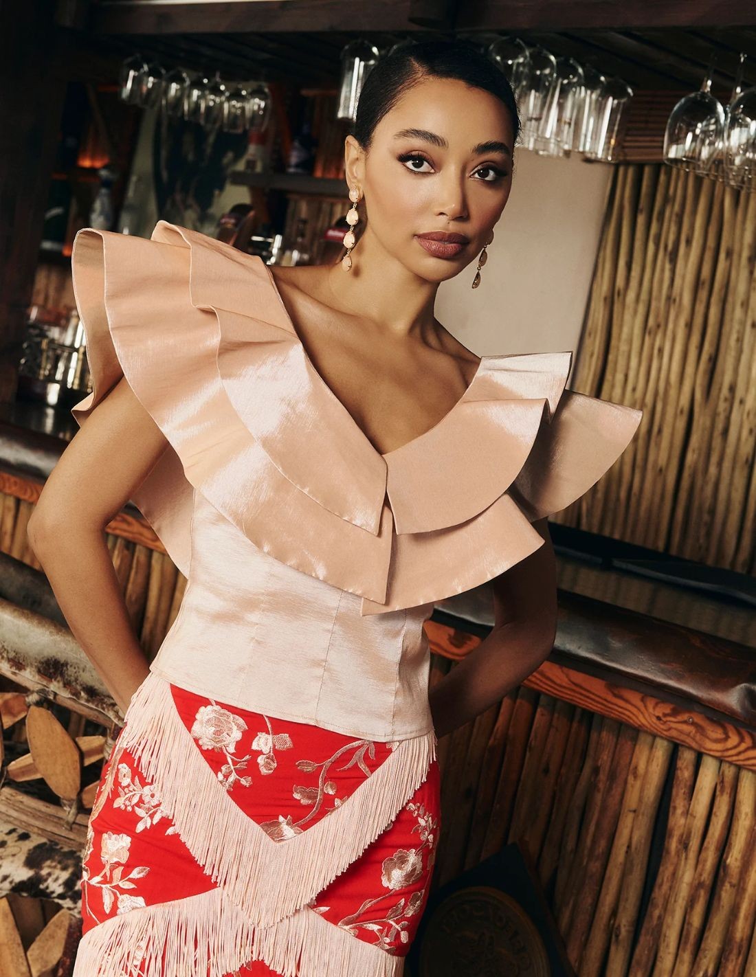 Este top beige está confeccionado en tafetán elástico de alta calidad , un tejido que combina estructura y comodidad para un acabado elegante y favorecedor. Su diseño se caracteriza por un escote en pico en la parte delantera y una original espalda en pico invertido, ambos realzados con un doble volante que aporta volumen y un toque sofisticado. Los costadillos, presentes tanto en el delantero como en la espalda, ayudan a definir la silueta y estilizar la figura.