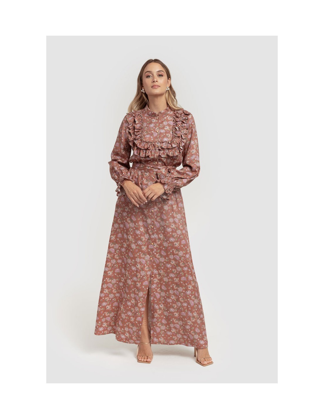 Descubre la elegancia casual con este vestido estampado floral en tonos marrones. Confeccionado en un tejido ligero y fluido, cuenta con delicados volantes en el pecho y las mangas, que aportan un estilo sofisticado.