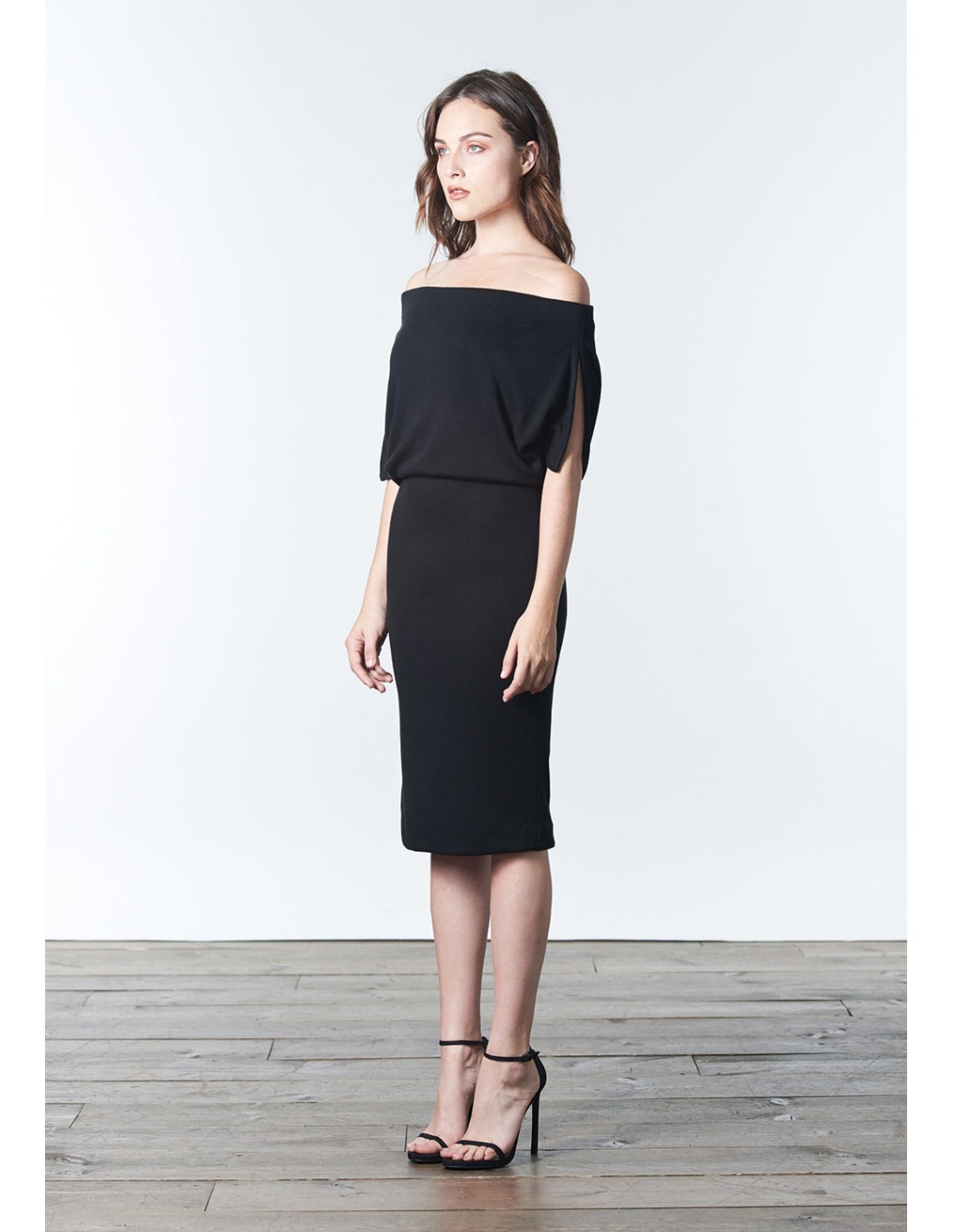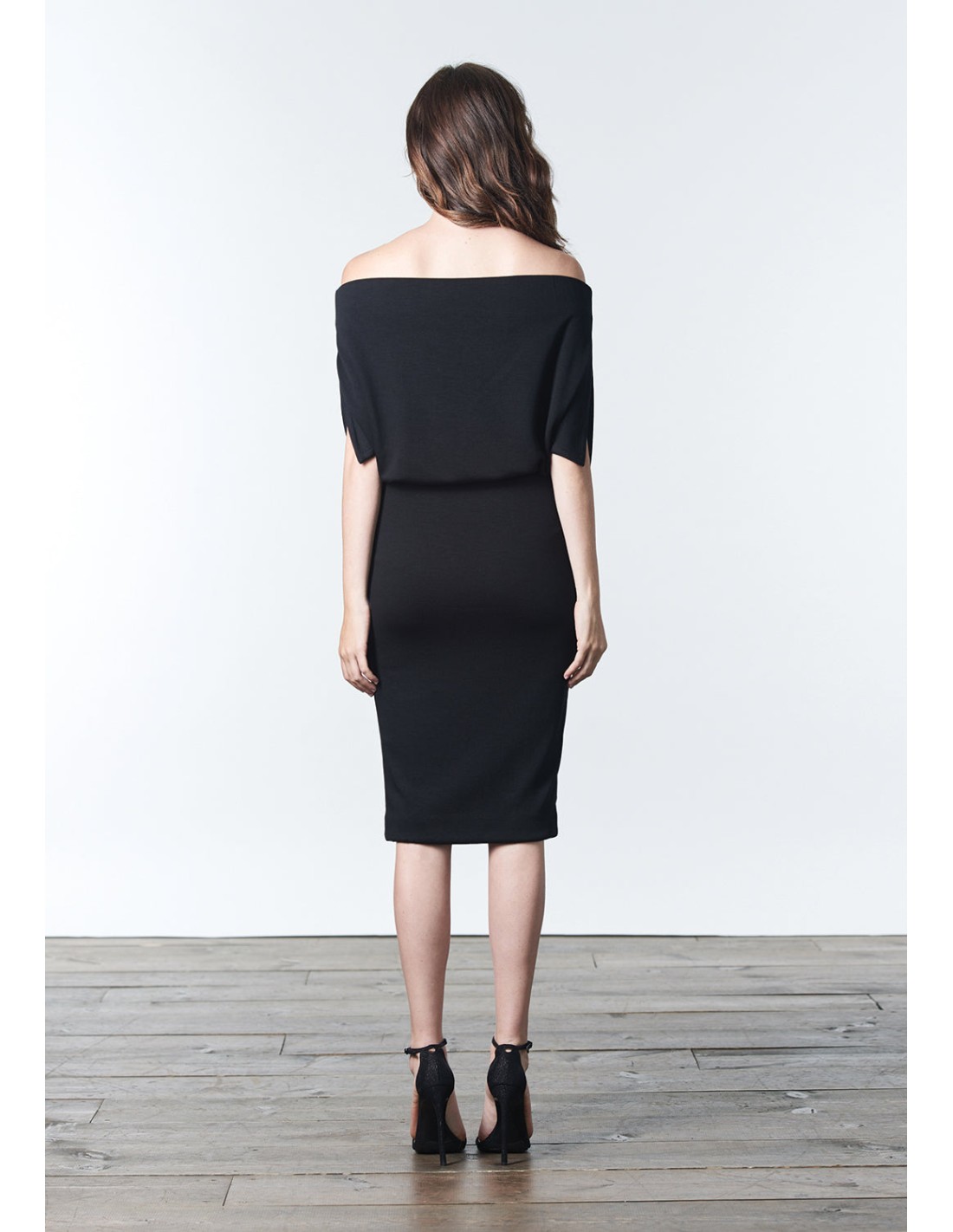 Este vestido midi está confeccionado en un punto grueso y sostenible de Tencel, diseñado para usarse de tres formas: con escote abierto al hombro, asimétrico con un solo hombro o elevado, evocando el estilo clásico de Audrey Hepburn. Este vestido combina un ajuste ceñido en las caderas con un diseño blusón en el cuerpo, realzando las curvas naturales de los hombros.
