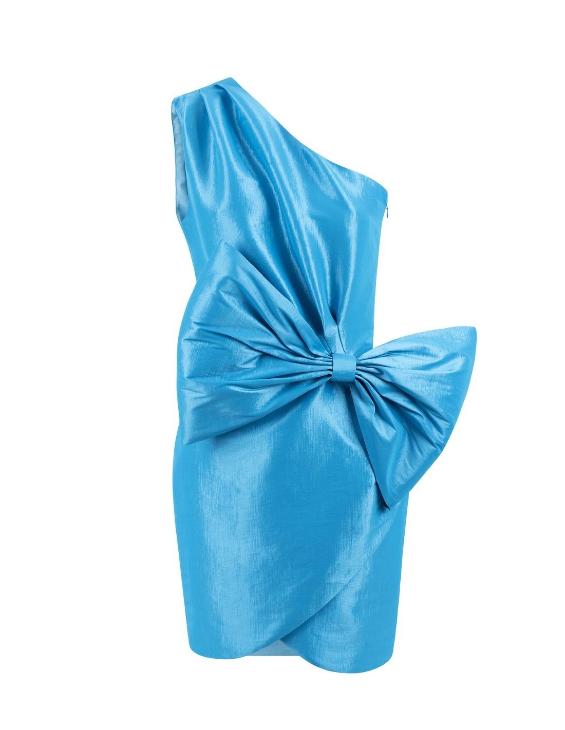 Moderno y elegante vestido corto de fiesta con lazada y escote asimétrico realizado en tafetán. Una pieza totalmente en tendencia que captará miradas.