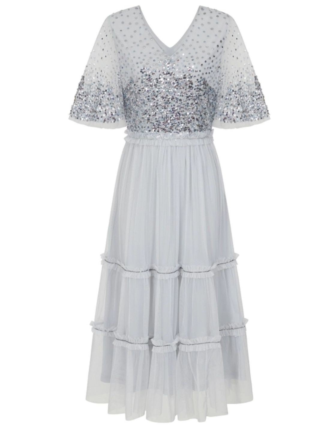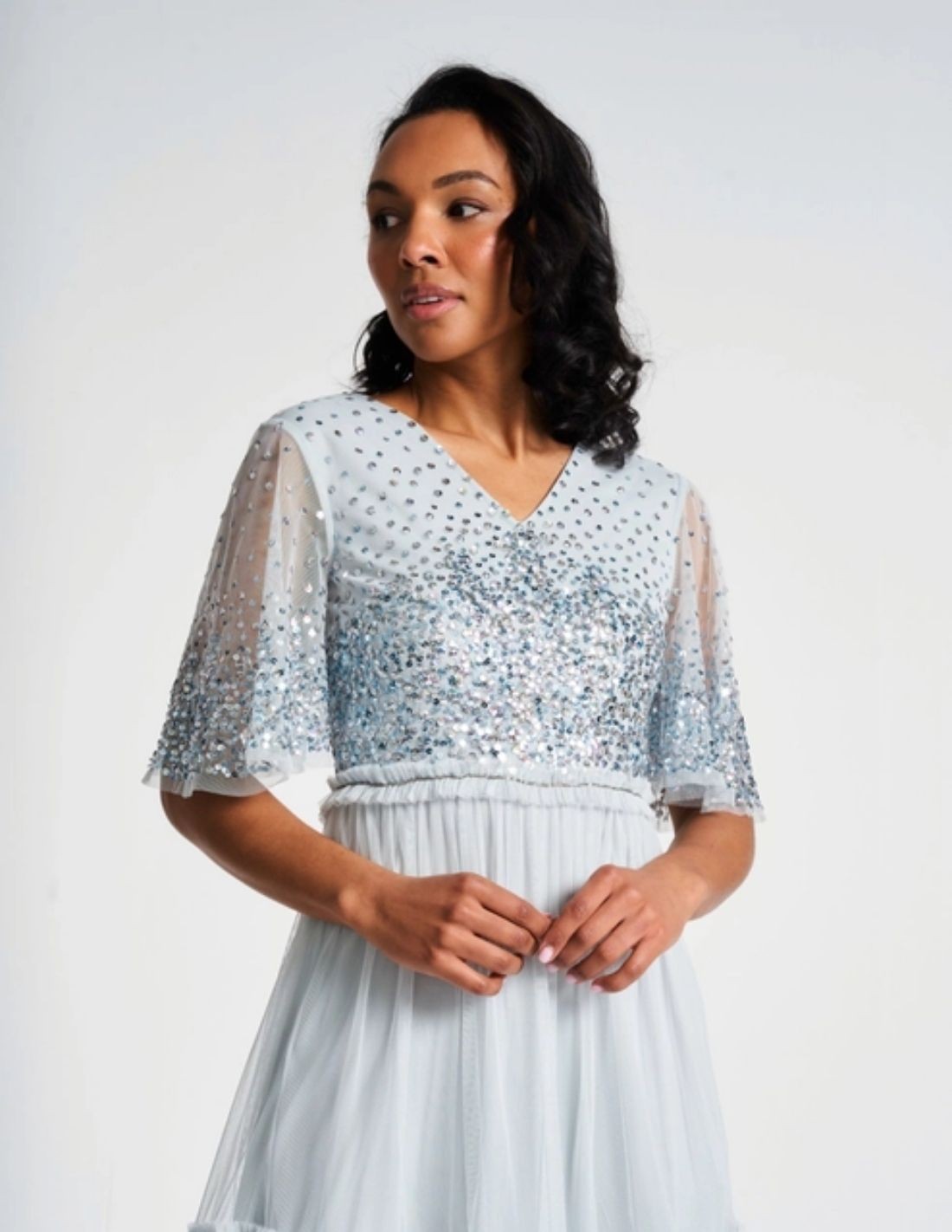 Este vestido para invitadas se confecciona en un delicado tul bordado de lentejuelas color azul éter.