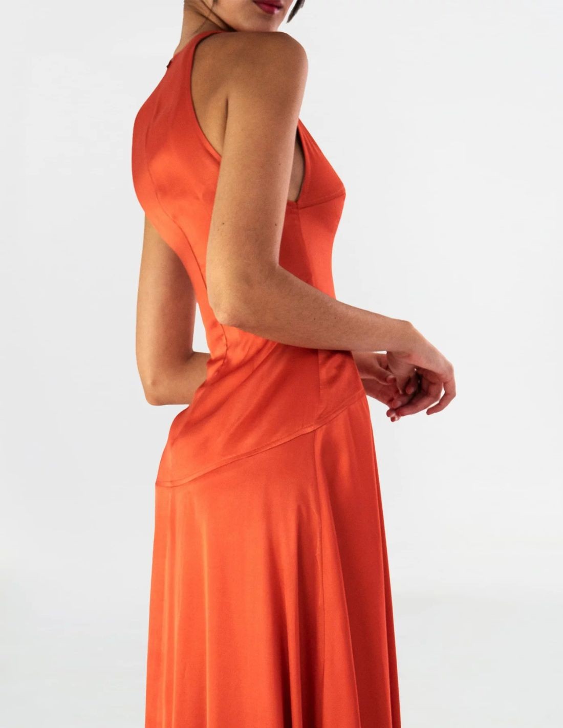 Conviértete en la invitada perfecta con este espectacular vestido de cóctel en color naranja, una opción vibrante y favorecedora para eventos especiales. Confeccionado en un suave y ligero crepe satén, este diseño destaca por su escote halter, que estiliza hombros y cuello, y una falda evasé con vuelo, que aporta movimiento y frescura al caminar.