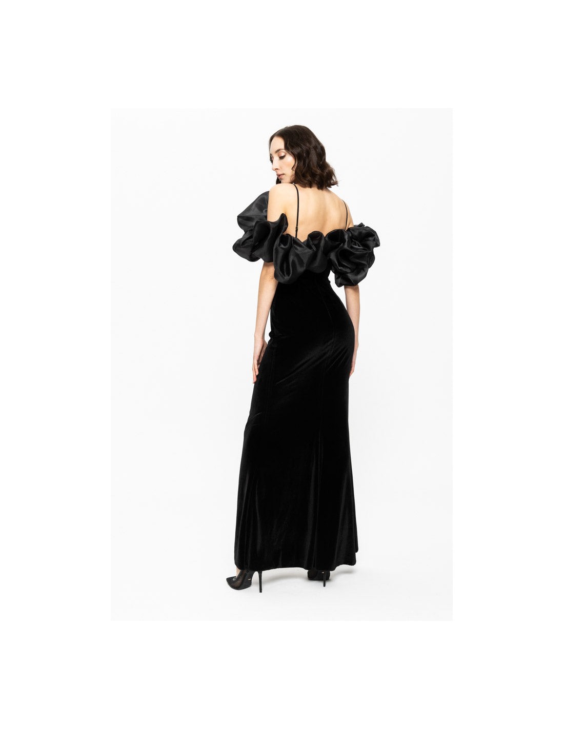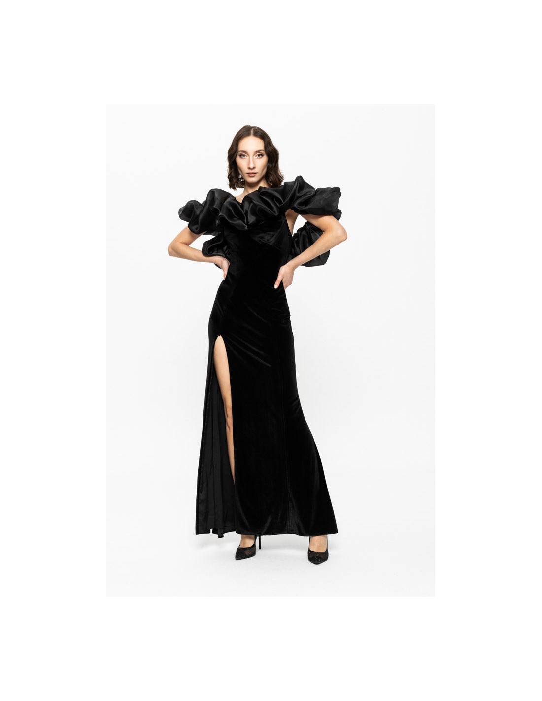 Este deslumbrante vestido negro de fiesta largo con volumen y abertura que realza delicadamente los hombros y el busto, aportando una sofisticada feminidad a la silueta.