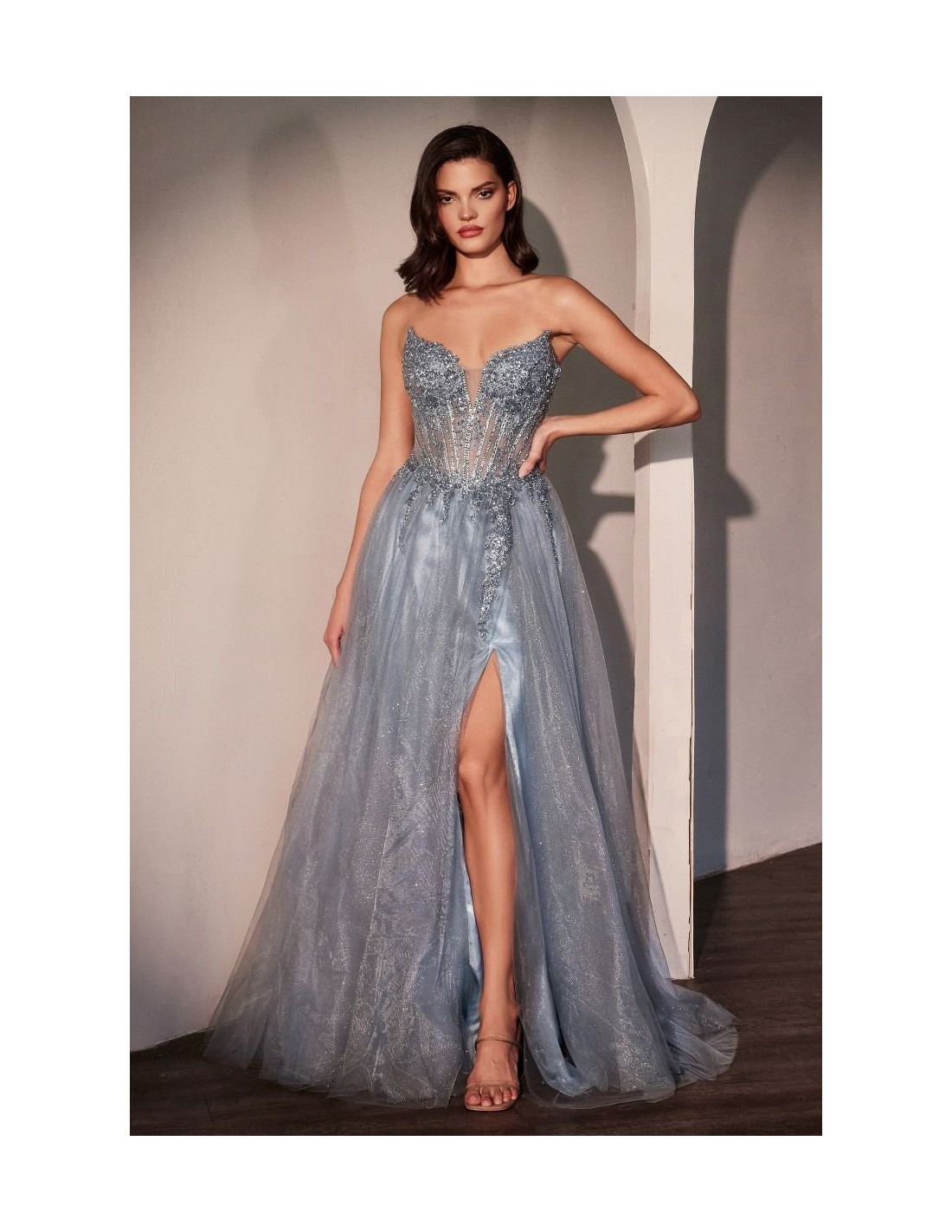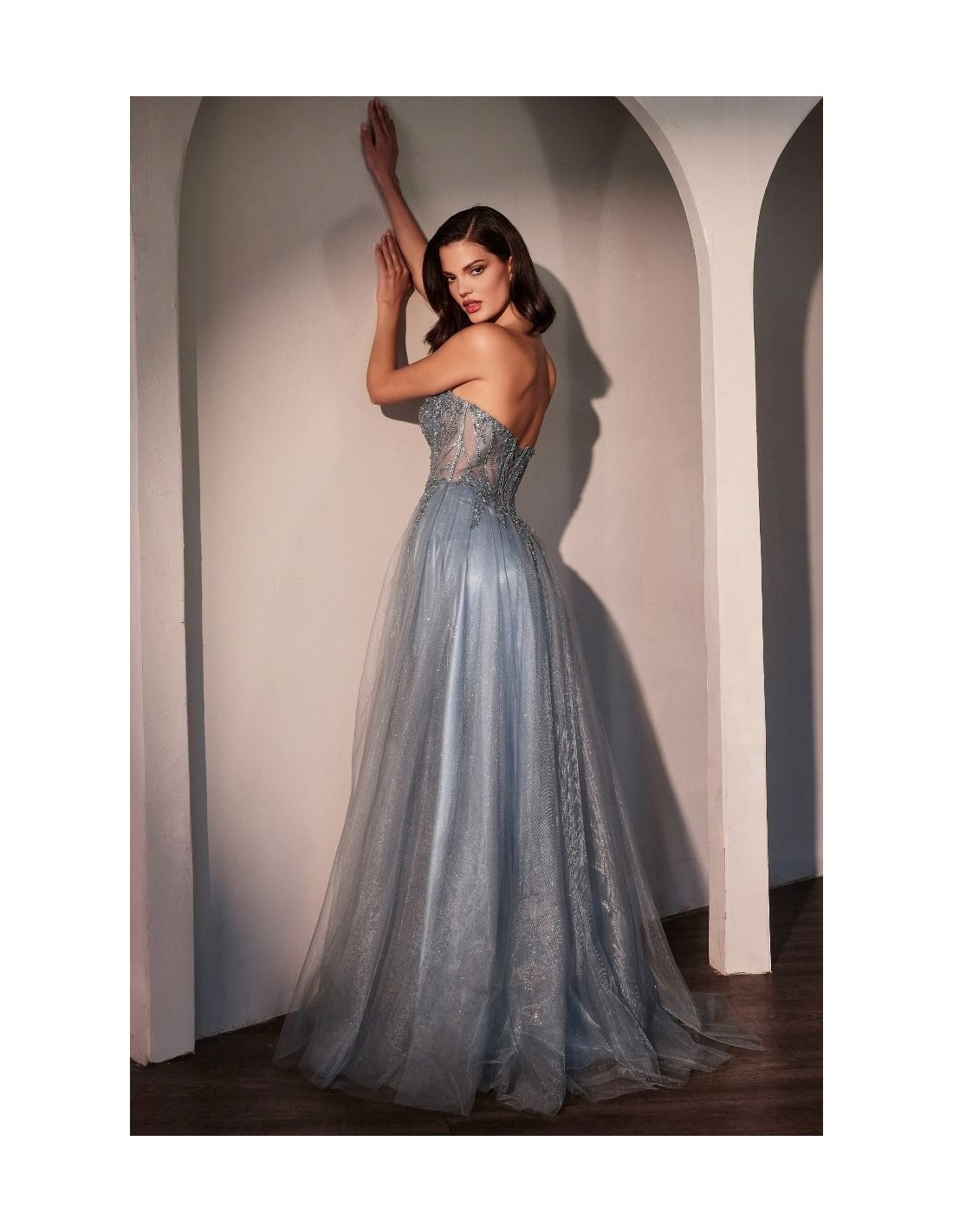 La falda de tul en capas aporta movimiento y ligereza, creando un efecto etéreo y romántico. Su diseño palabra de honor con escote corazón profundo realza la figura, y el corsé con varillas y lazada en la espalda garantiza un ajuste perfecto.
