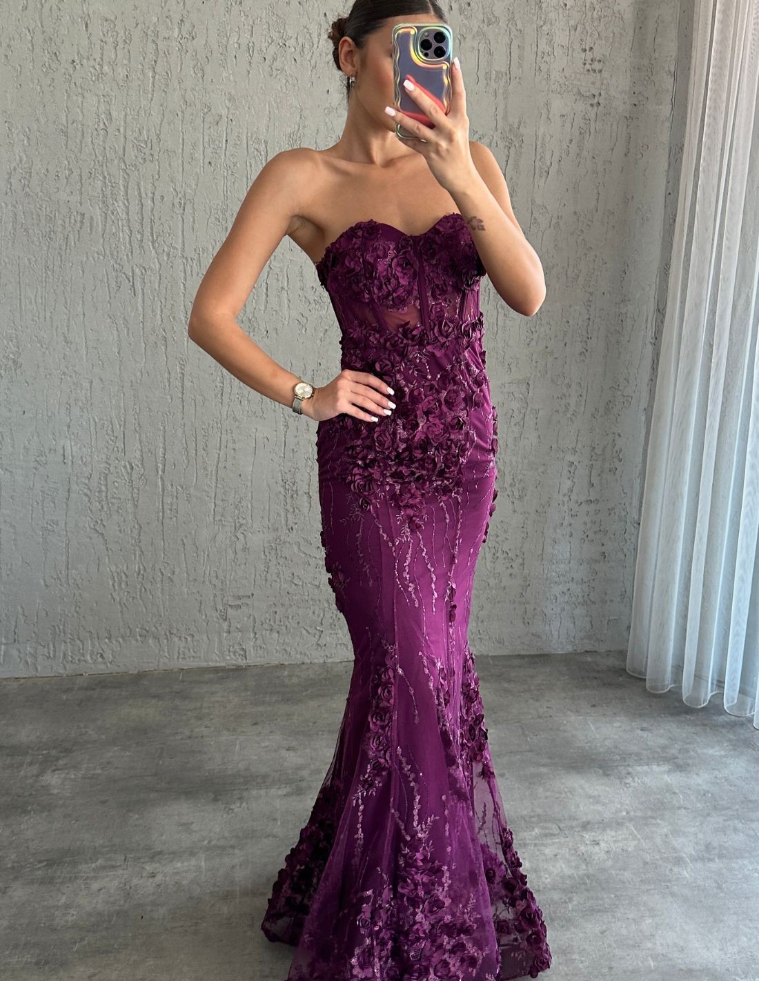 Este deslumbrante vestido semi-transparente presenta un escote palabra de honor, y un bordado en forma de rosas esparcido por todo el diseño. Un enfoque audaz y moderno, perfecto para una ocasión especial o una noche de gala.