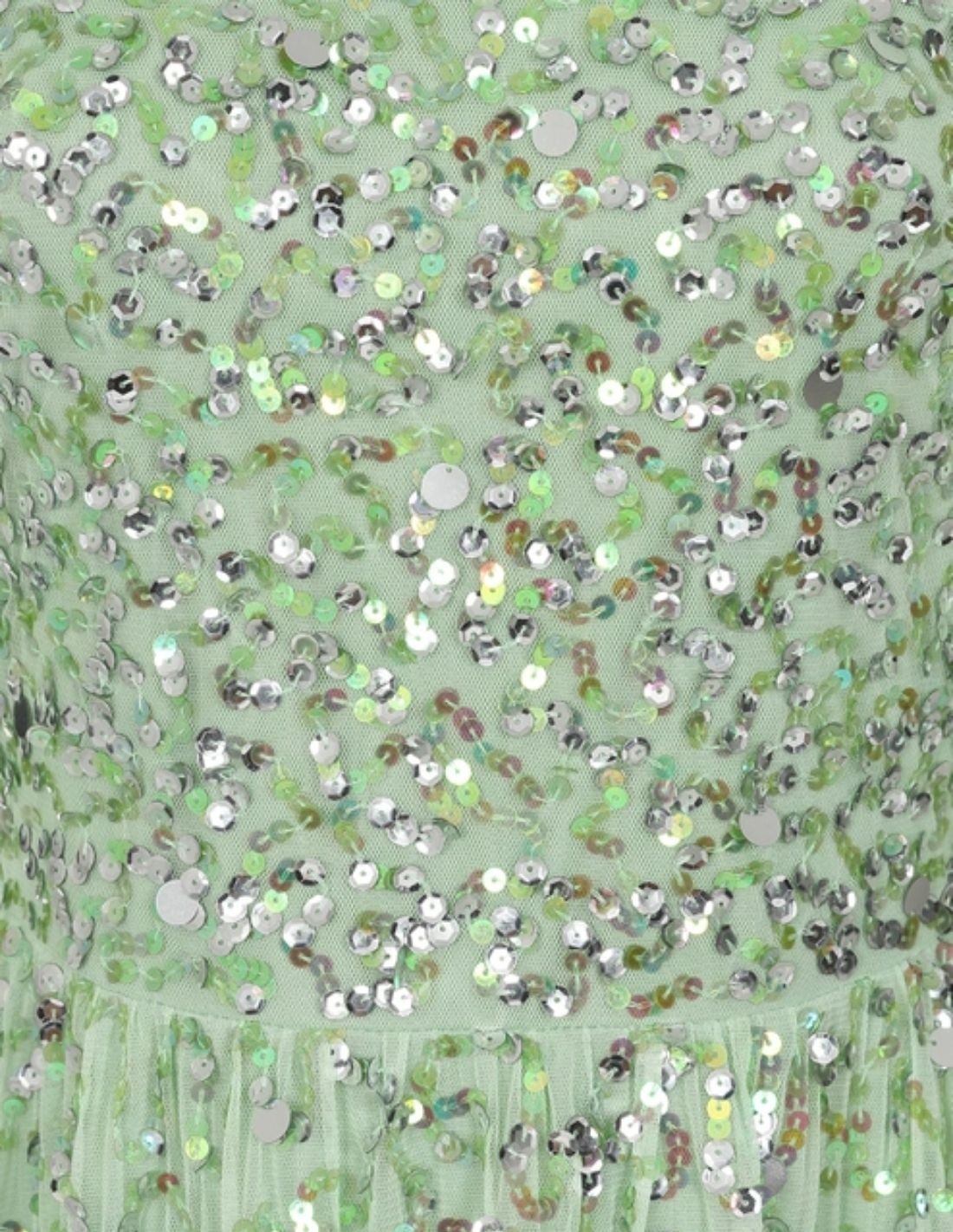 Vestido de fiesta largo verde menta con lentejuelas y volantes