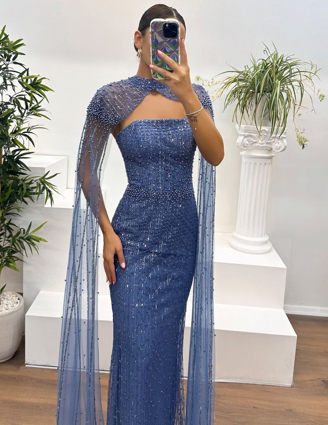 Vestido de fiesta largo de pedrería con manga capa