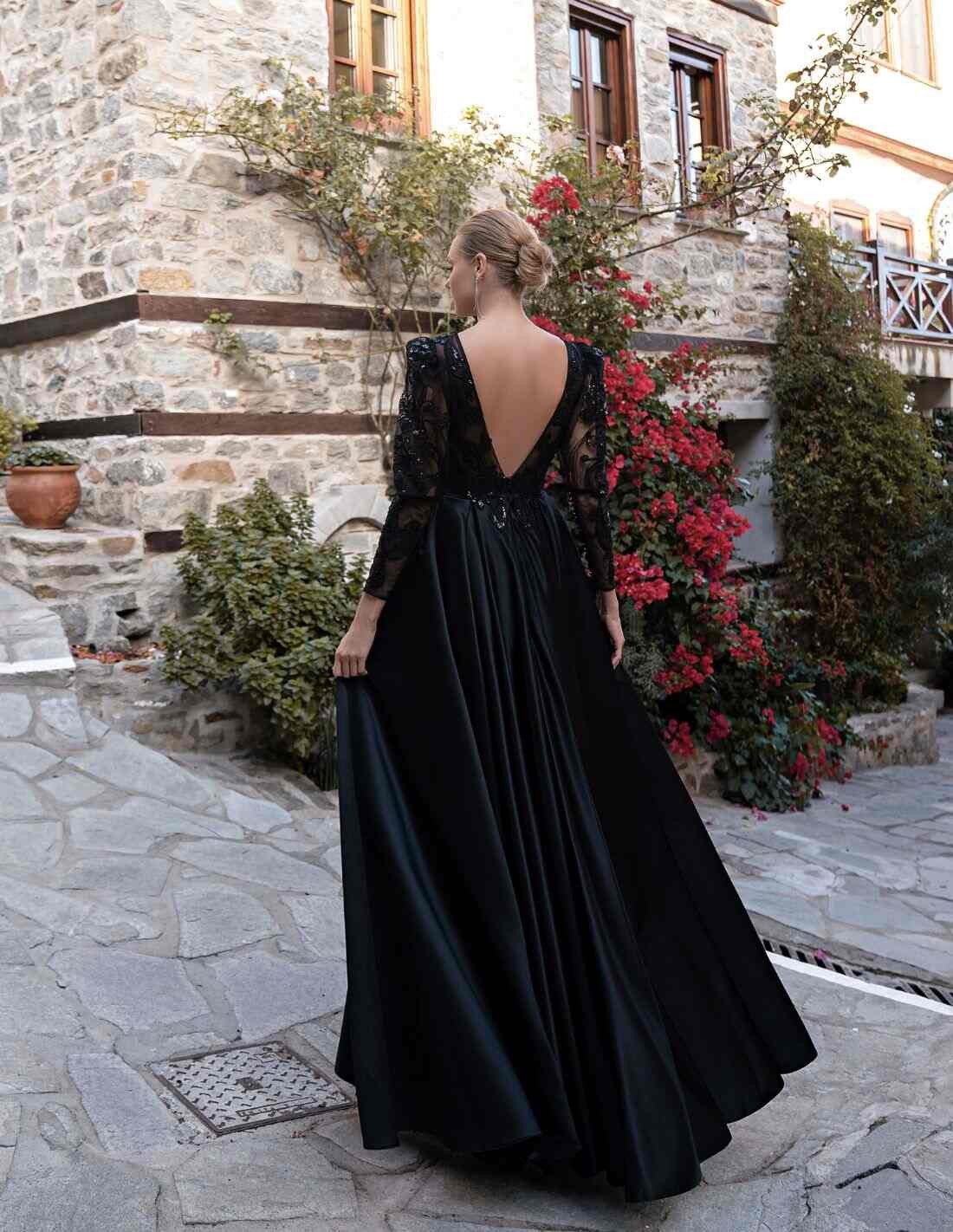 Este elegante diseño incorpora un escote cuadrado con forma, lo más espectacular sus mangas largas bordadas de pedrería, una maxi falda efecto satén y en su espalda un escote sensual en forma de V que acaba cerrando con una cremallera invisible.