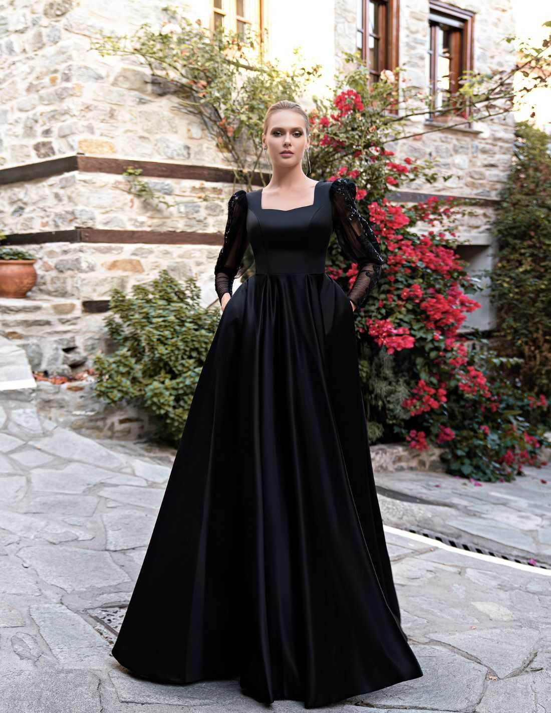 Vestido de gala largo con mangas bordadas y maxi falda satinada