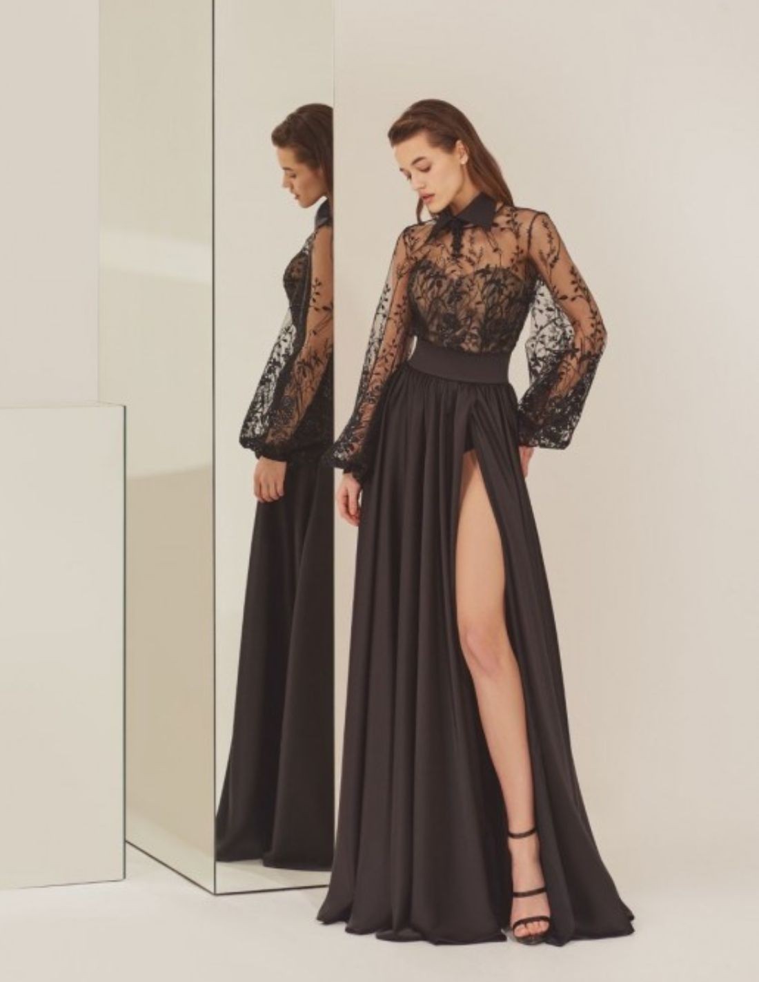 Este conjunto de invitada a evento se realiza en crepe combinado con encaje bordado en color negro e incluye un collar con solapas. Su diseño consta de un body de encaje bordado salvaje de manga larga y falda larga con cintura ancha, y abertura lateral. Cierra con botones forrados y cremallera invisible.
