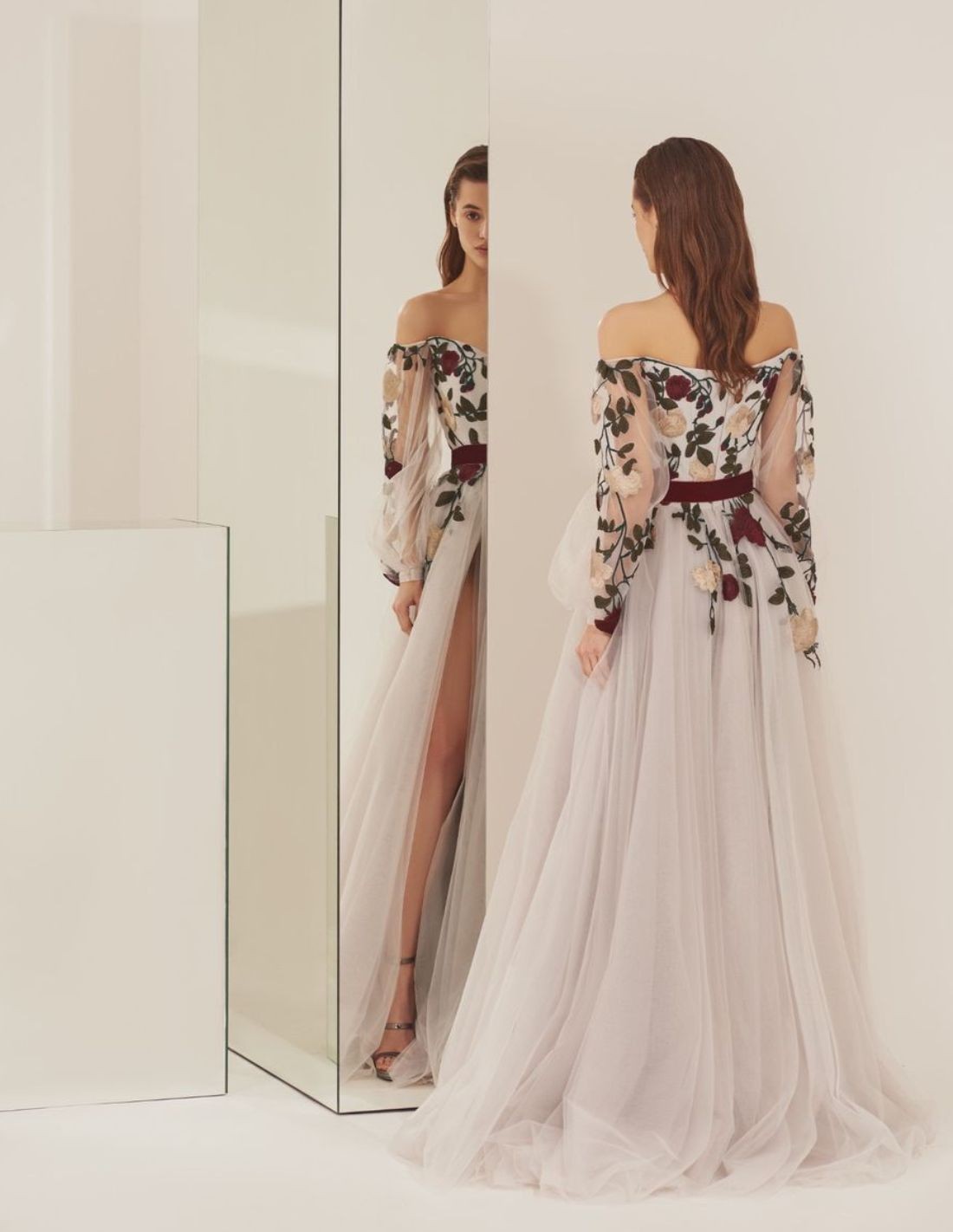 Este vestido de invitada a bodas se realiza en una base de crepe con tul combinado de aplique floral. Su diseño presenta un escote bardot de manga larga abullonada, cuerpo bordado de flores, cinturilla burdeos y falda larga de tul. Cierra en la espalda con cremallera invisible.