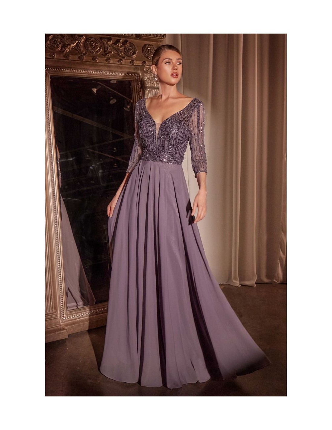Vestido de fiesta largo con manga francesa y escote en pico. Diseño elegante con cuerpo de pedrería y falda de vuelo en chiffon
