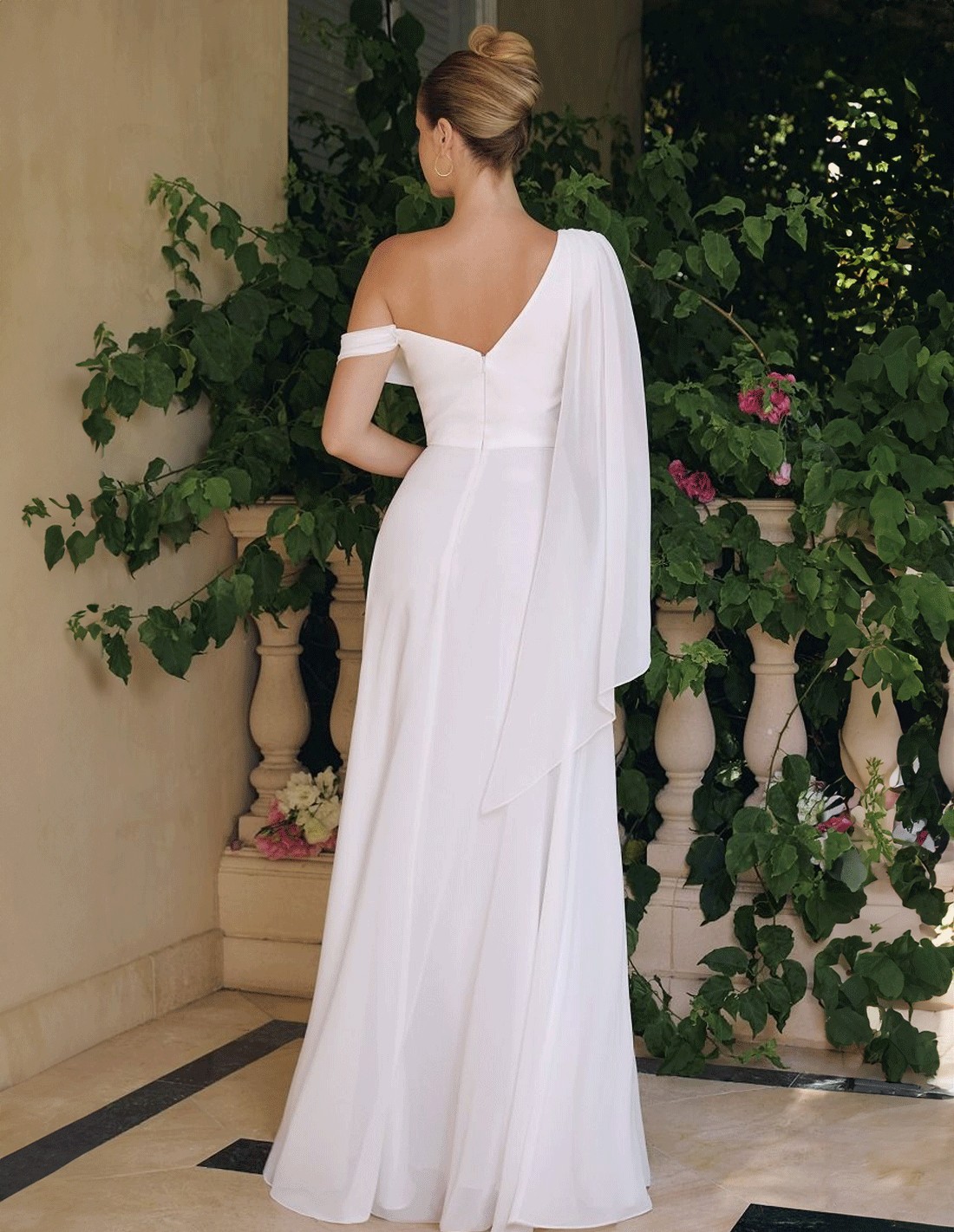 Vestido de novia de estilo griego con escote asimétrico en chiffon | Elegancia y sencillez