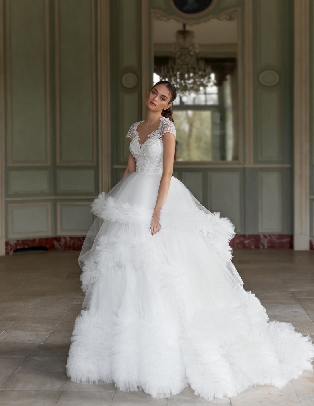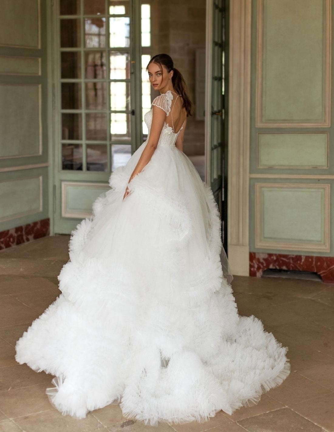 Lo más impresionante de este vestido es su voluminosa falda en corte princesa, confeccionada con capas de tul con bordes estructurados, que aportan un movimiento único y un efecto de ensueño al caminar.