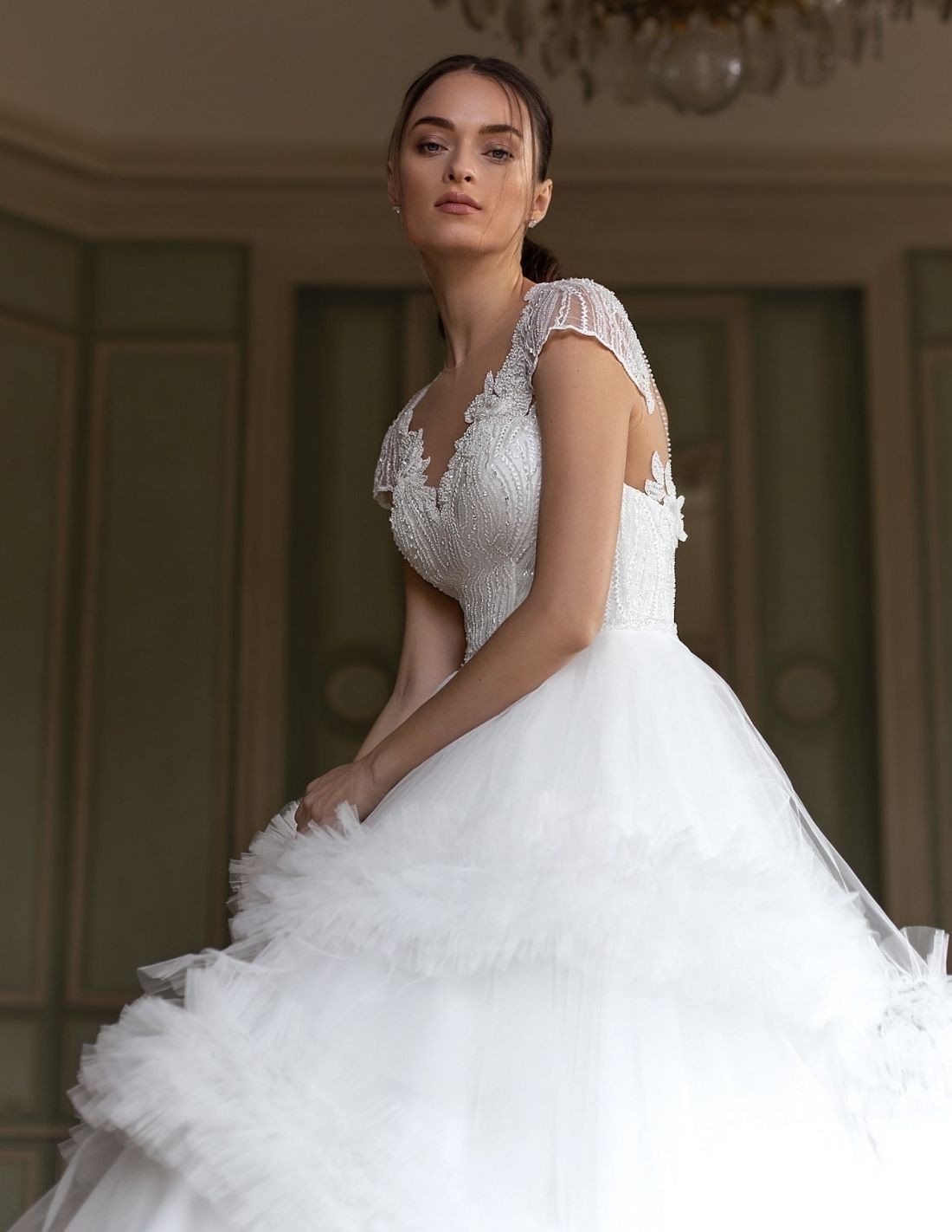 Vestido de novia con cuerpo de pedrería y falda de tul
