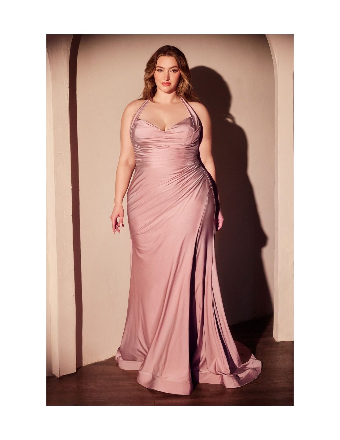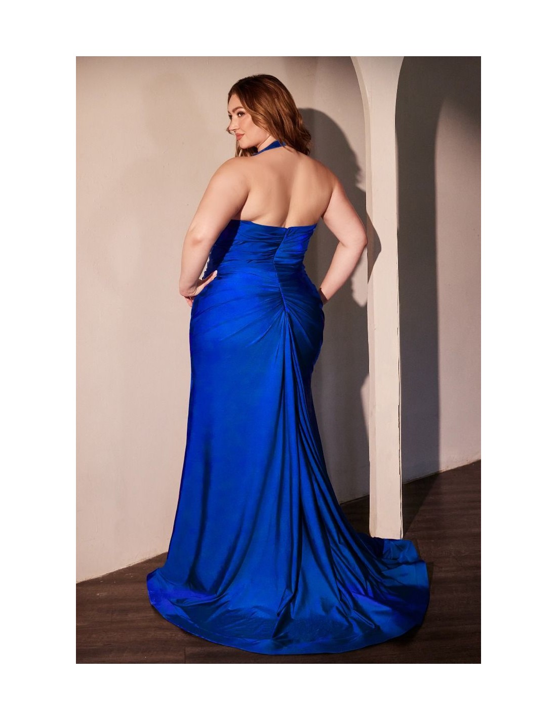 Impresionante Vestido de fiesta largo en satén, diseñado para tallas grandes, con escote halter, cintura fruncida y abertura en la pierna. ¡Perfecto para invitadas de boda y eventos formales!