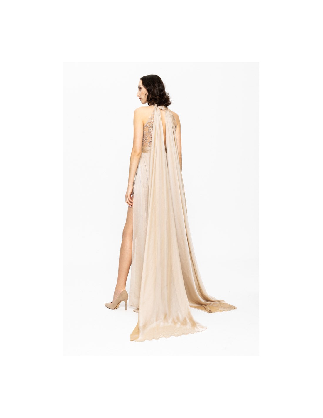 Este deslumbrante vestido de gala largo beige con escote halter y abertura frontal destaca por su diseño sofisticado y moderno.
