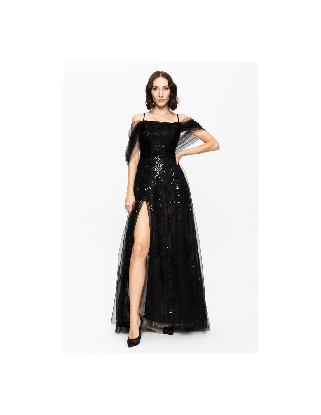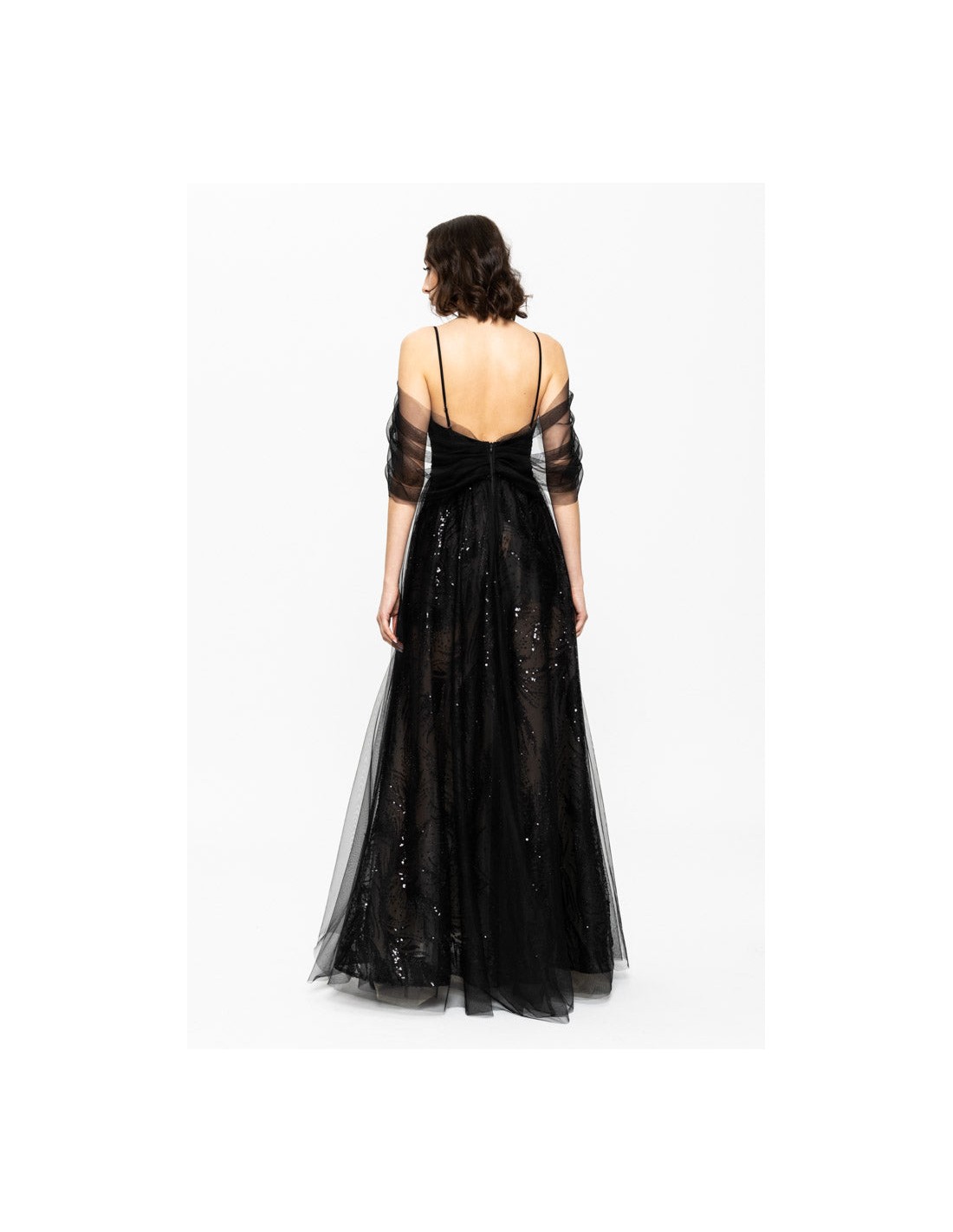 Las mangas de tul caídas y semitransparentes aportan un aire etéreo y romántico al vestido. Estas mangas flotantes caen suavemente sobre los brazos, creando una sensación de ligereza y delicadeza mientras añaden un toque de sofisticación. El tul semitransparente añade un sutil contraste con las lentejuelas brillantes del vestido, proporcionando equilibrio en el diseño y aportando un estilo sofisticado y refinado.